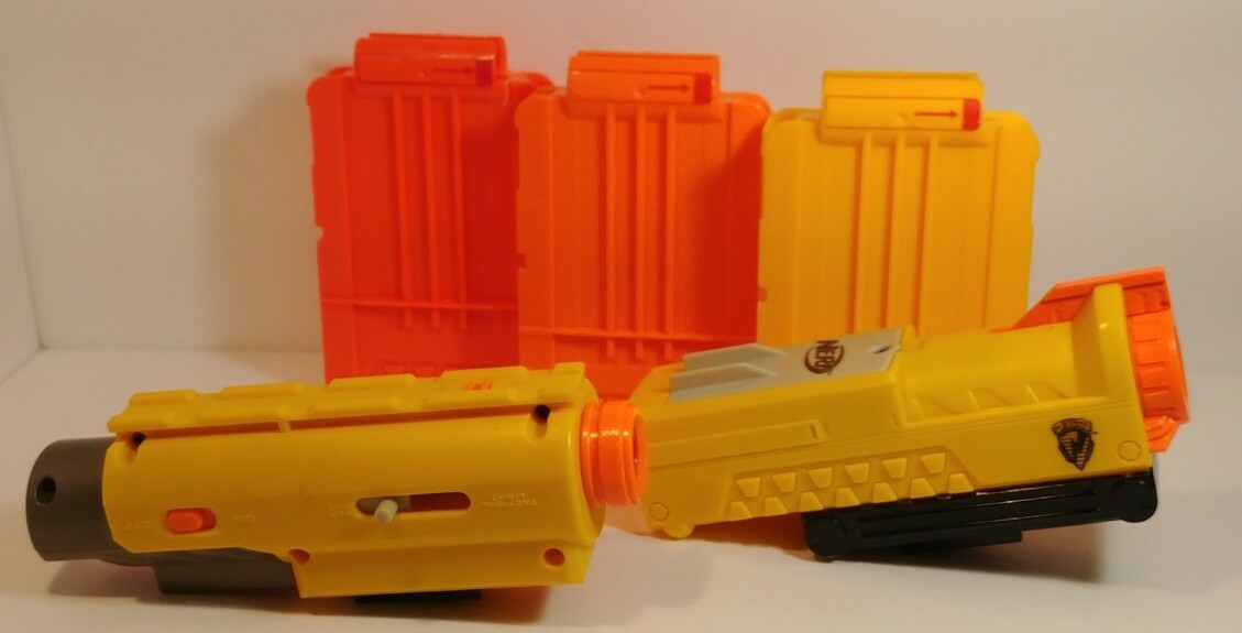 как выглядит 5 pc Bundle Nerf accessories 3 magazines 2 sights/scopes red green light фото