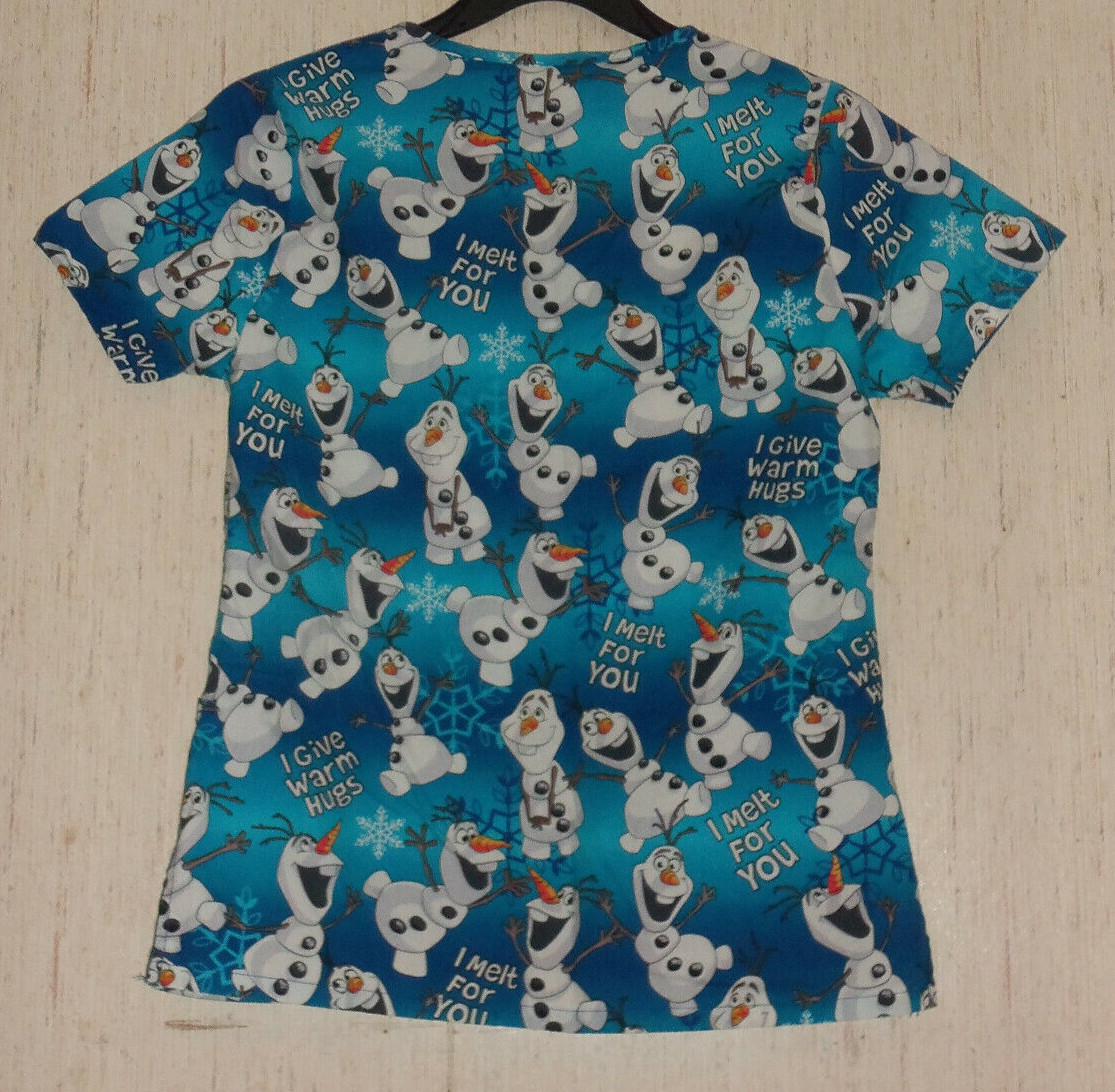 EXCELLENT WOMENS Disney OLAF WARM HUGS NOVELTY PRINT SCRUBS TOP SIZE XS