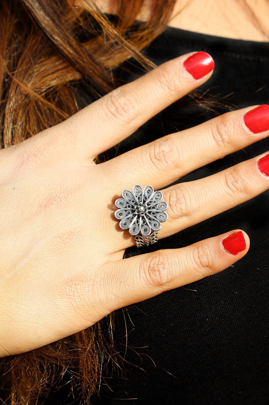 Handmade Oxidized Filigree Ring Jewelry Made of Sterling Silver, Telkari Ring