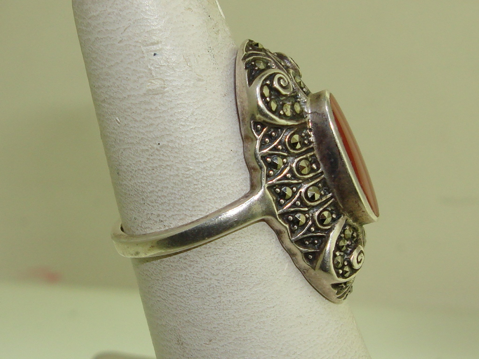 как выглядит ELEGANT VINTAGE 1980S ERA STERLING CARNELIAN MARCASITE RING SZ 7 фото