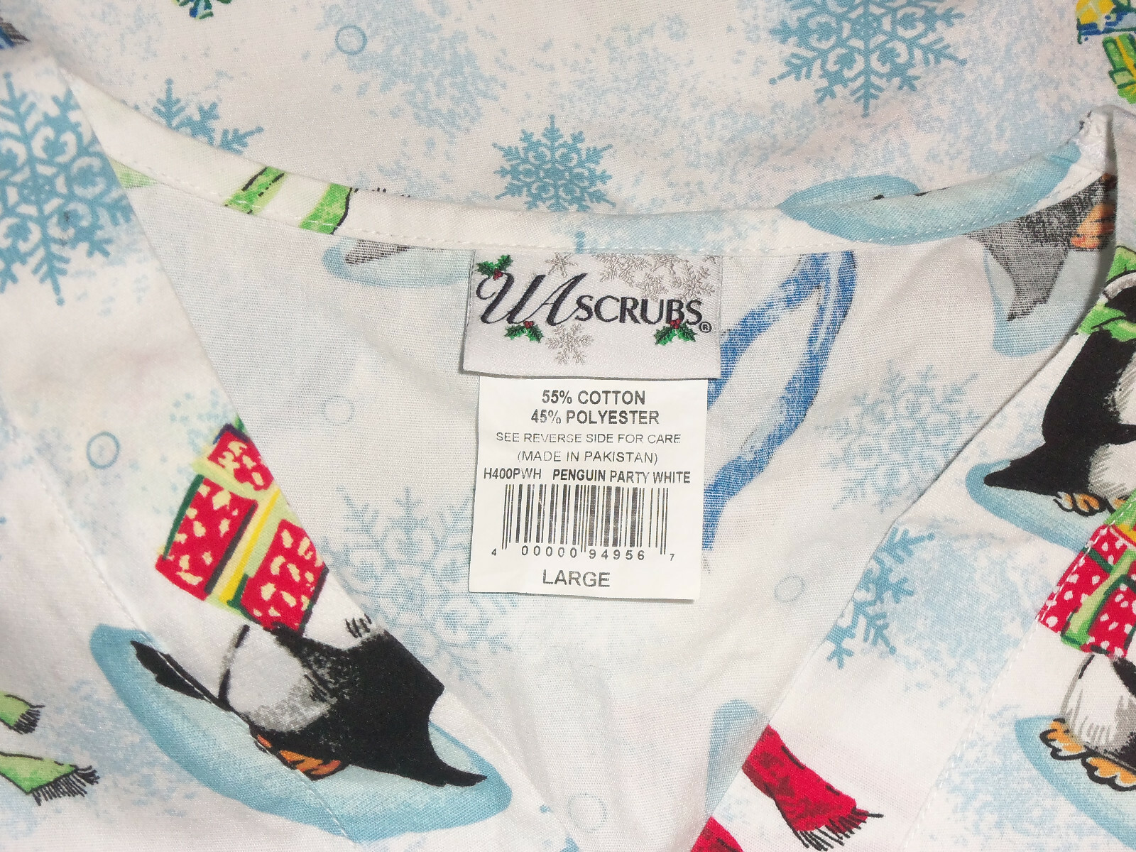 EXCELLENT WOMENS PENGUINS BEARING GIFTS NOVELTY PRINT SCRUBS TOP SIZE L