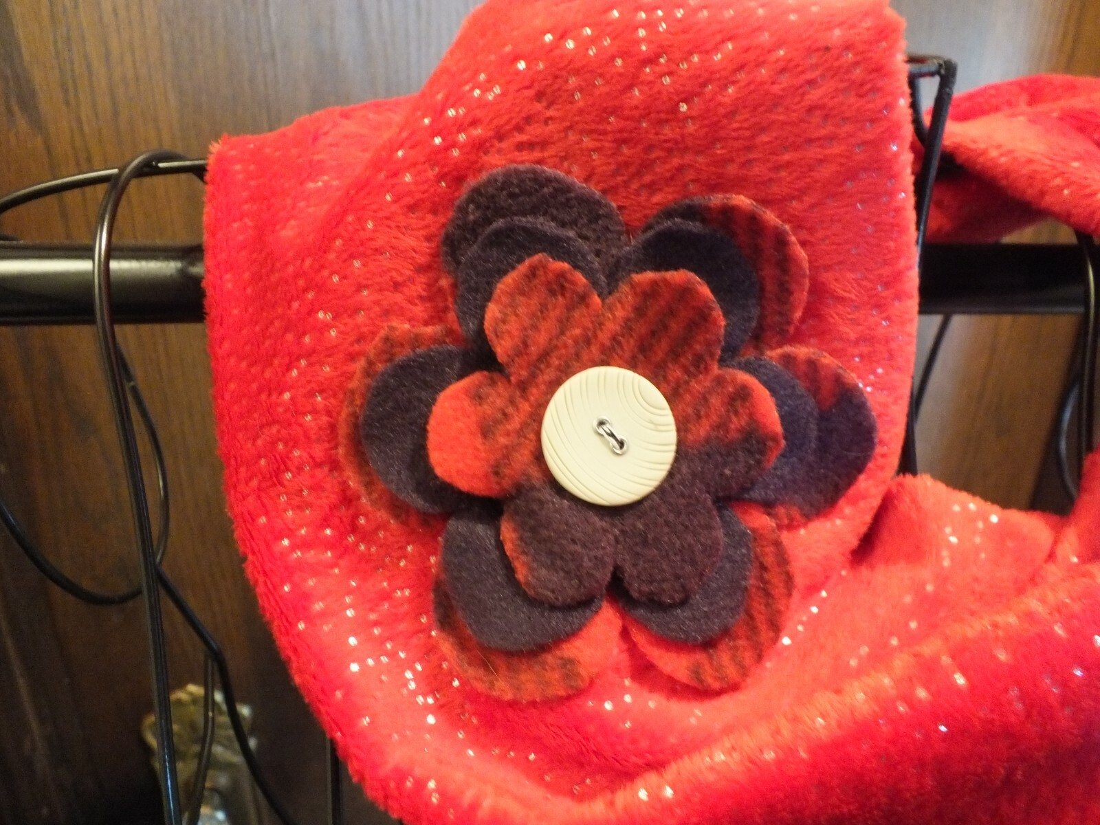 как выглядит Upcycled Repurposed Scarf Infinity Red Silver Specs Handmade Flower 28x5" Soft фото