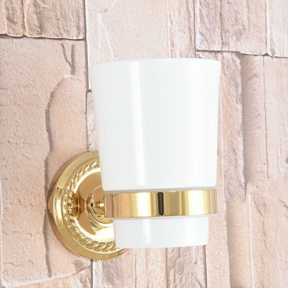 как выглядит Golden Brass Wall Mount Bathroom Toothbrush Holder With One Ceramic Cup 2ba592 фото
