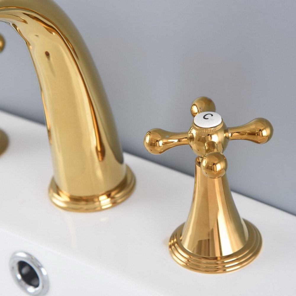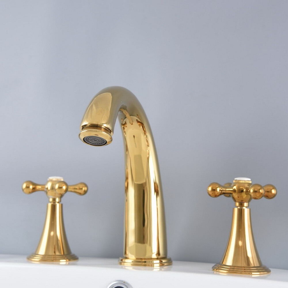 как выглядит Golden Brass Bathroom Faucet Three Hole Deck Mount Sink Bathtub Water Tap 2nf989 фото