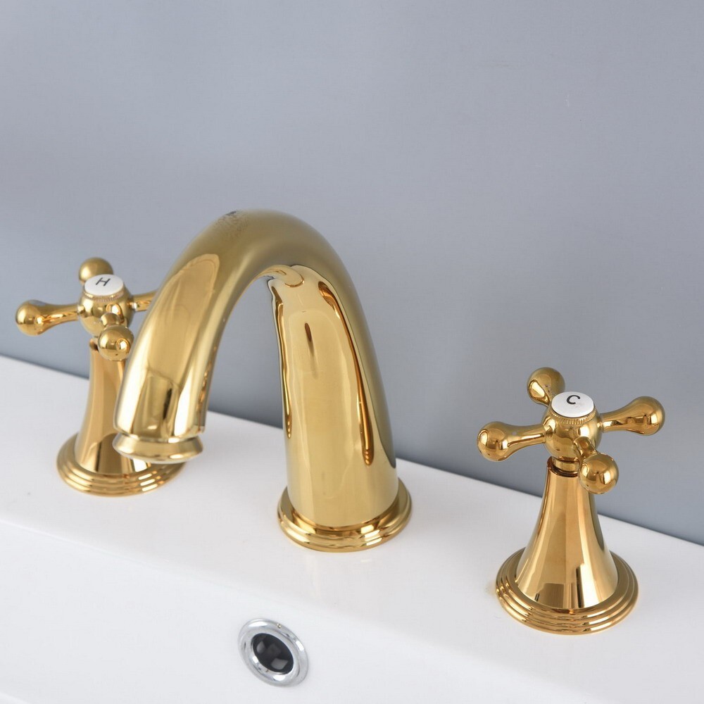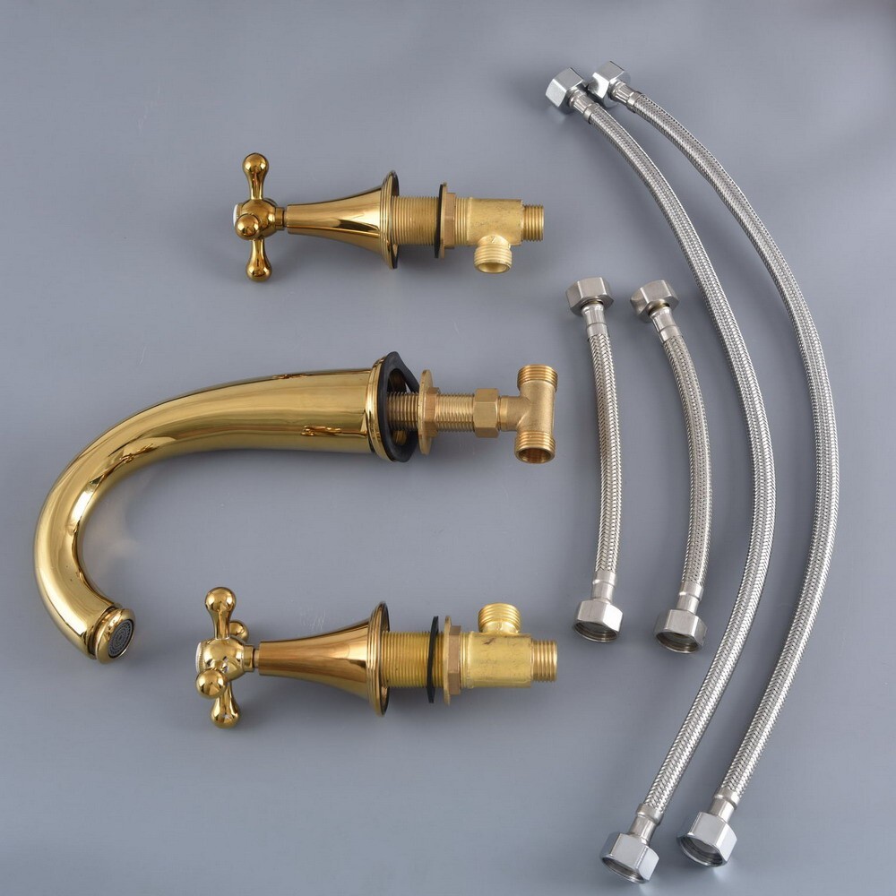 Golden Brass Bathroom Faucet Three Hole Deck Mount Sink Bathtub Water Tap 2nf989