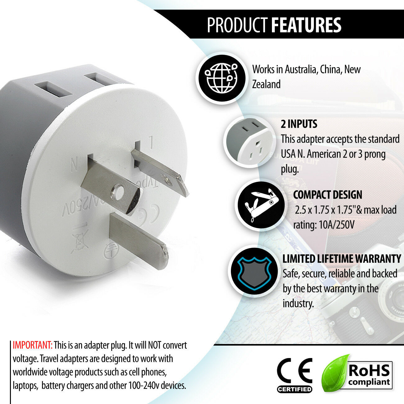 OREI Australia, New Zealand, China Travel Plug Adapter 2 USA Input 3 Pack Type I