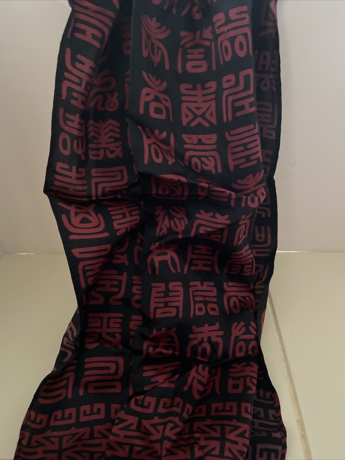 Vtg SHANGHAI MILL No. 5 100 SILK SCARF Navy with Maroon design 50 X 10 FRINGE