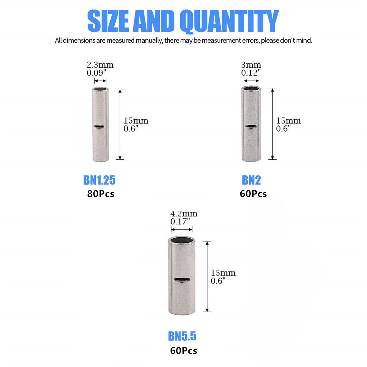 200pcs Non-Insulated Crimp Butt Connector Wire Terminals 10-22AWG