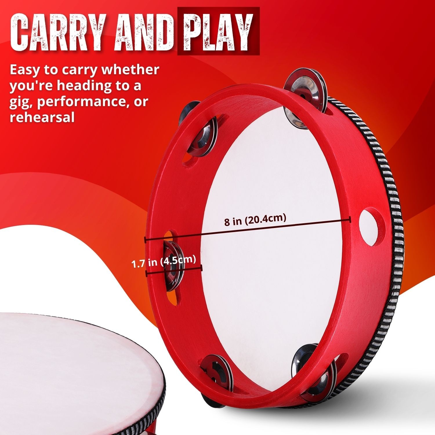 Wood Handheld Tambourine 8 Inch Single Row 5 Pair Jingles Red Hand Percussion