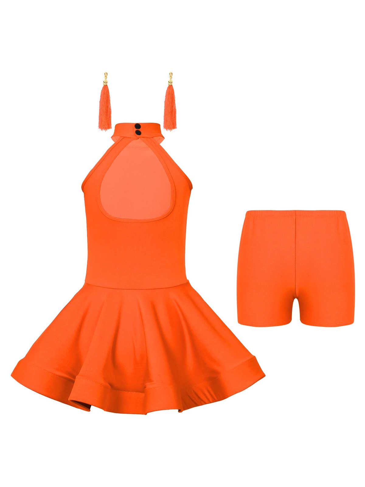 Girls Hollow Back Latin Ballroom Dress with Shorts Earrings Rumba Dance Costume