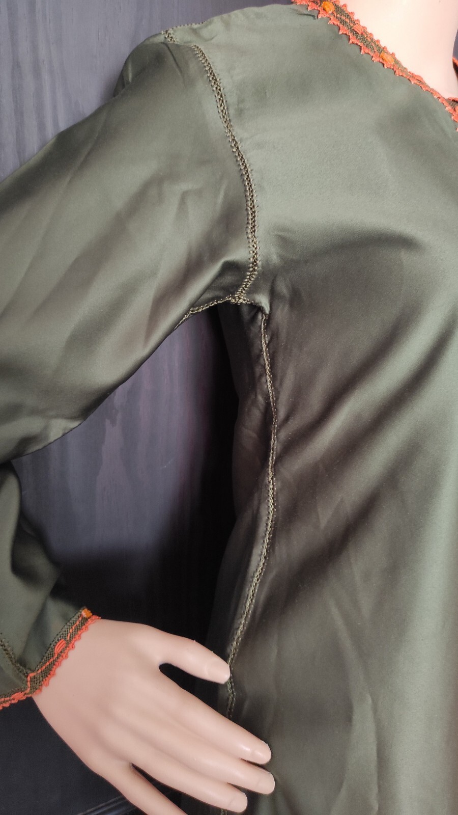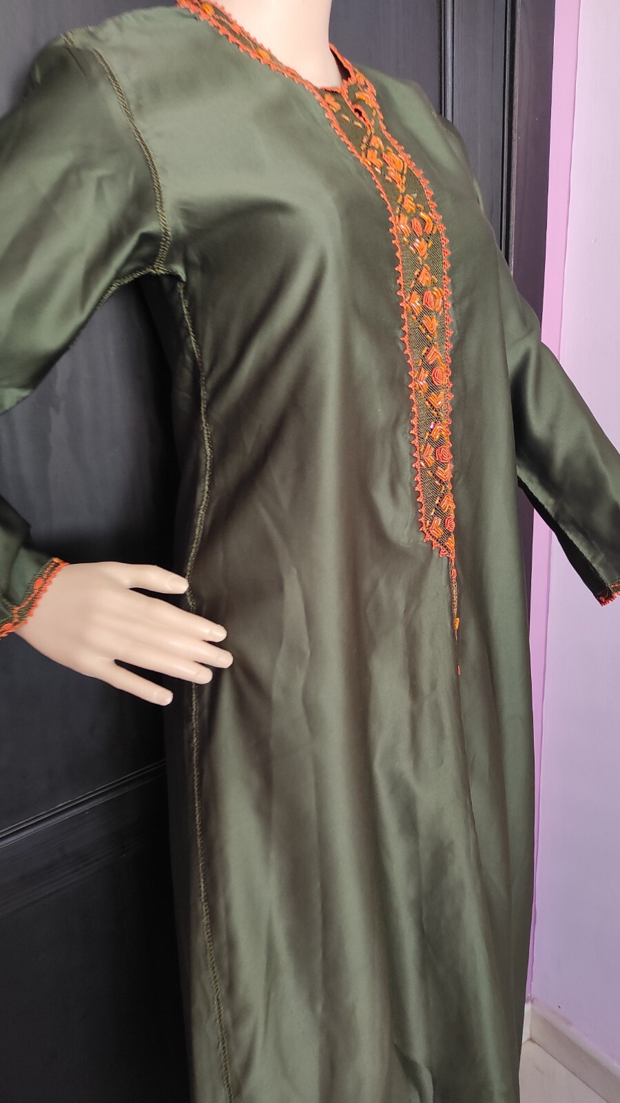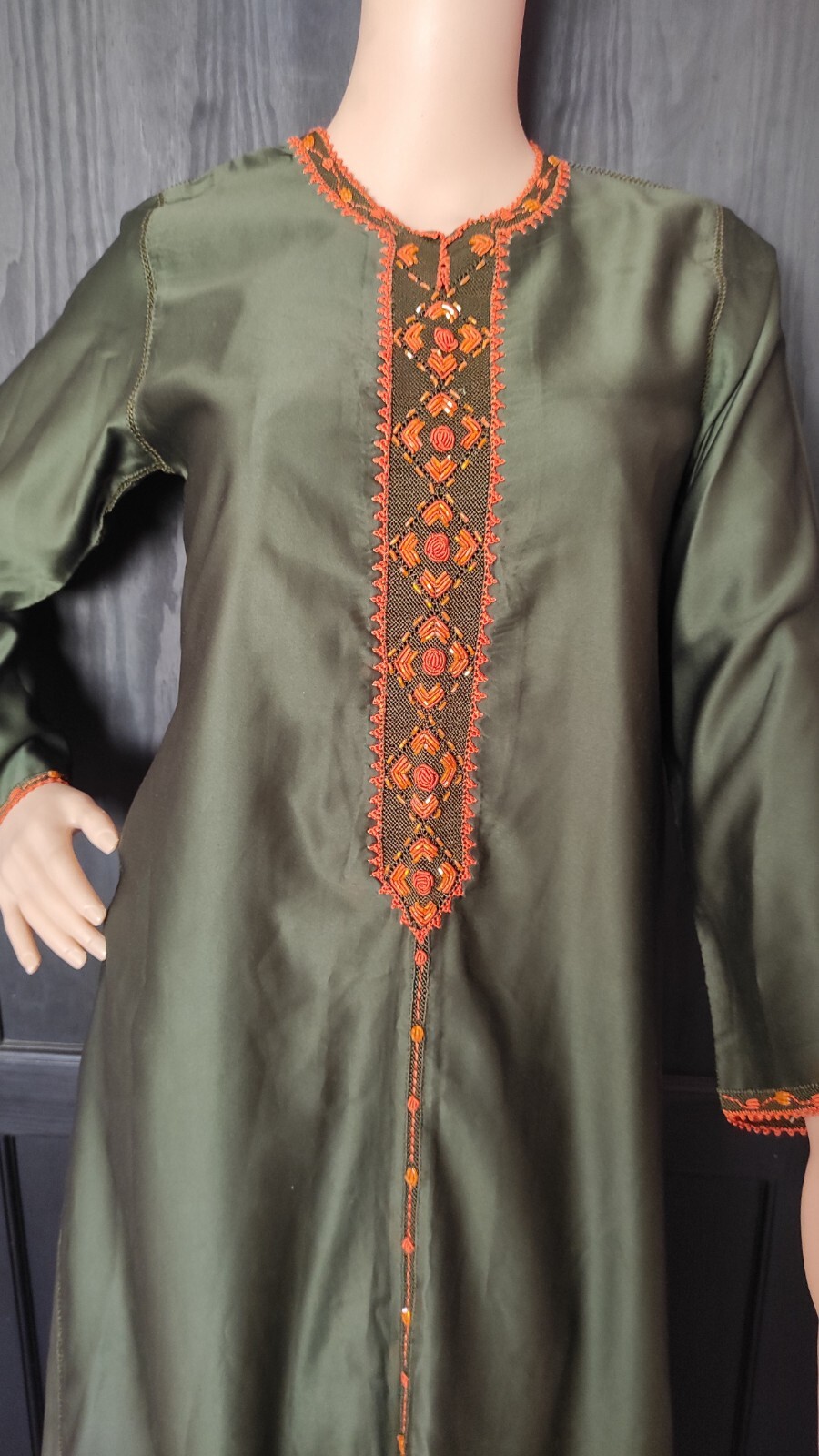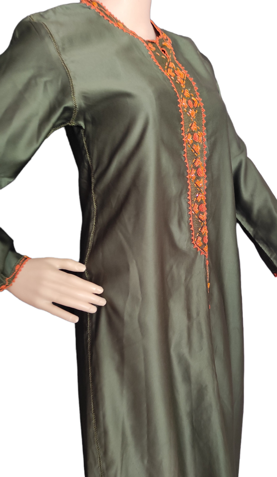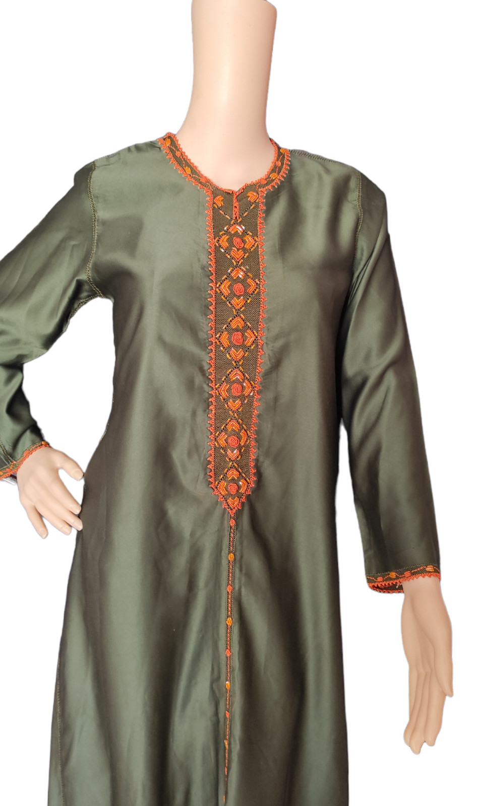 Moroccan Cross Stitch Hand Embroidery Olive Green Hand Crafted Randa Kaftan
