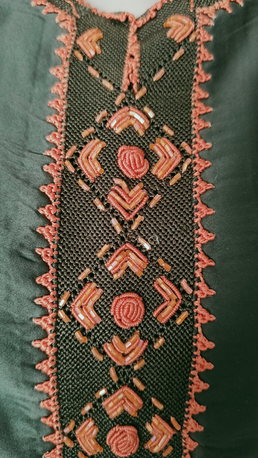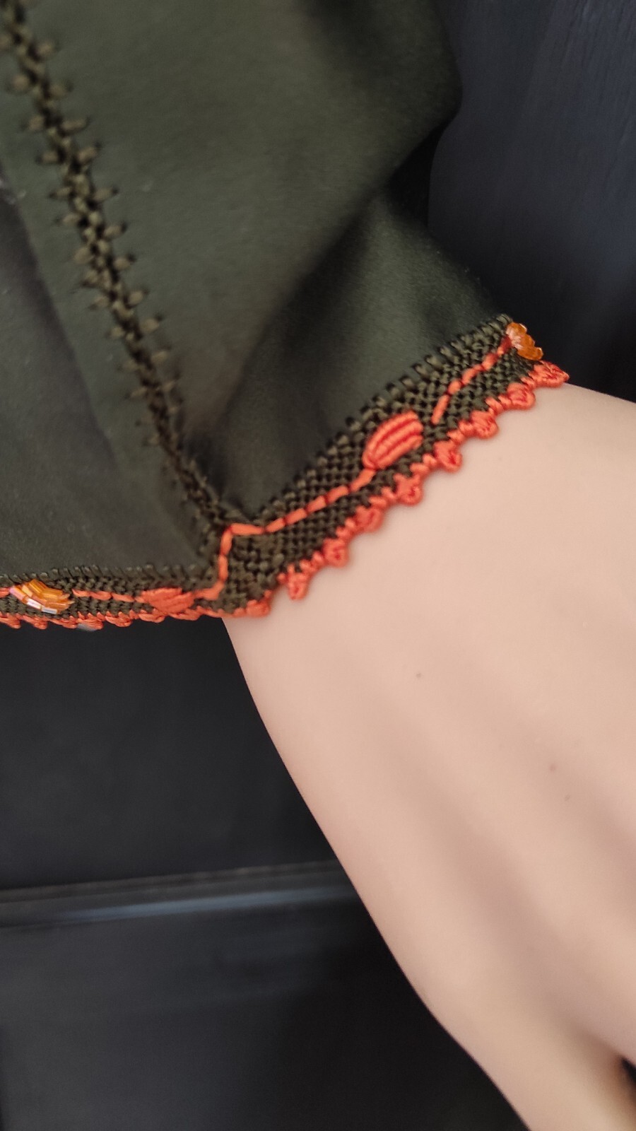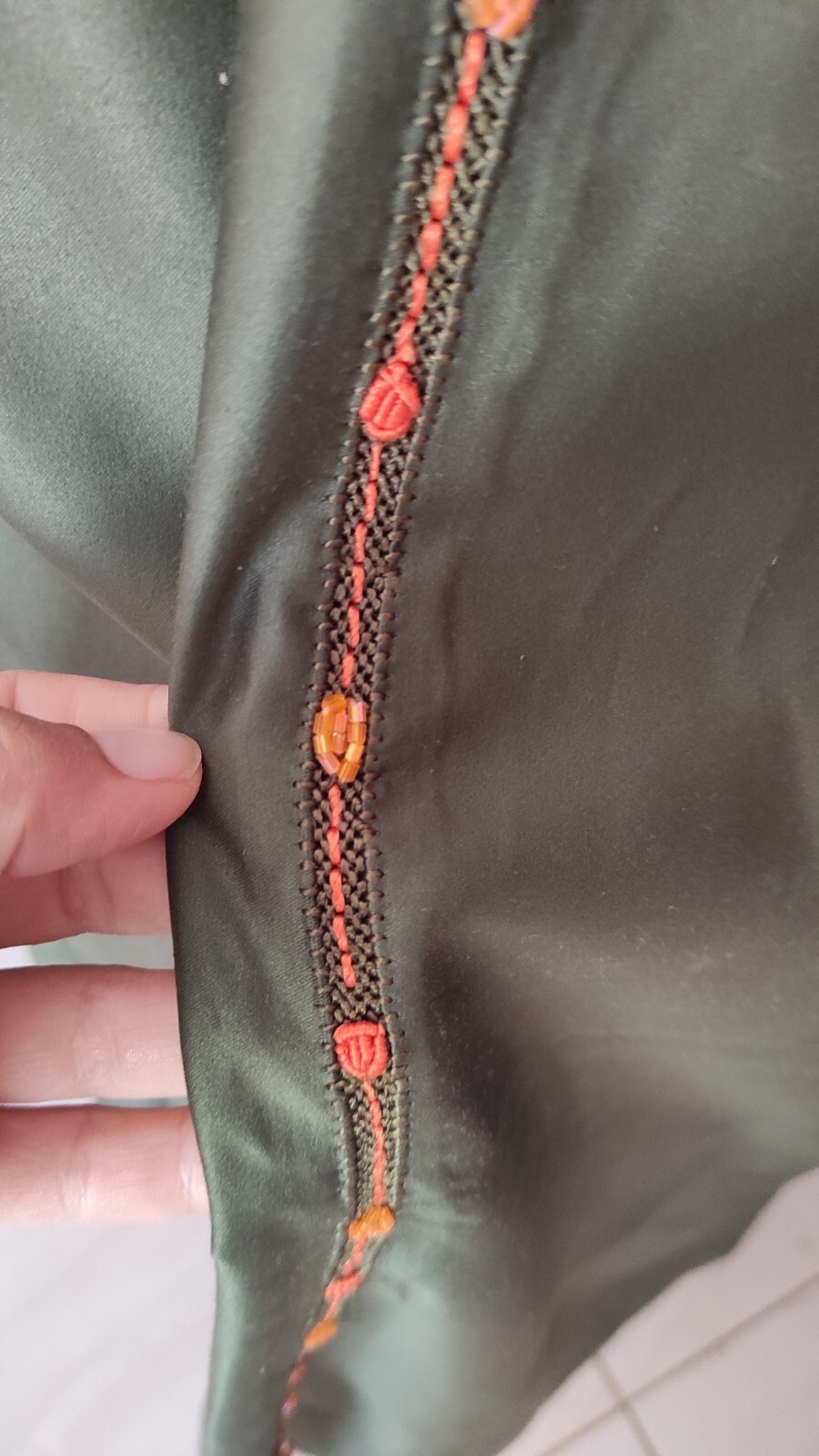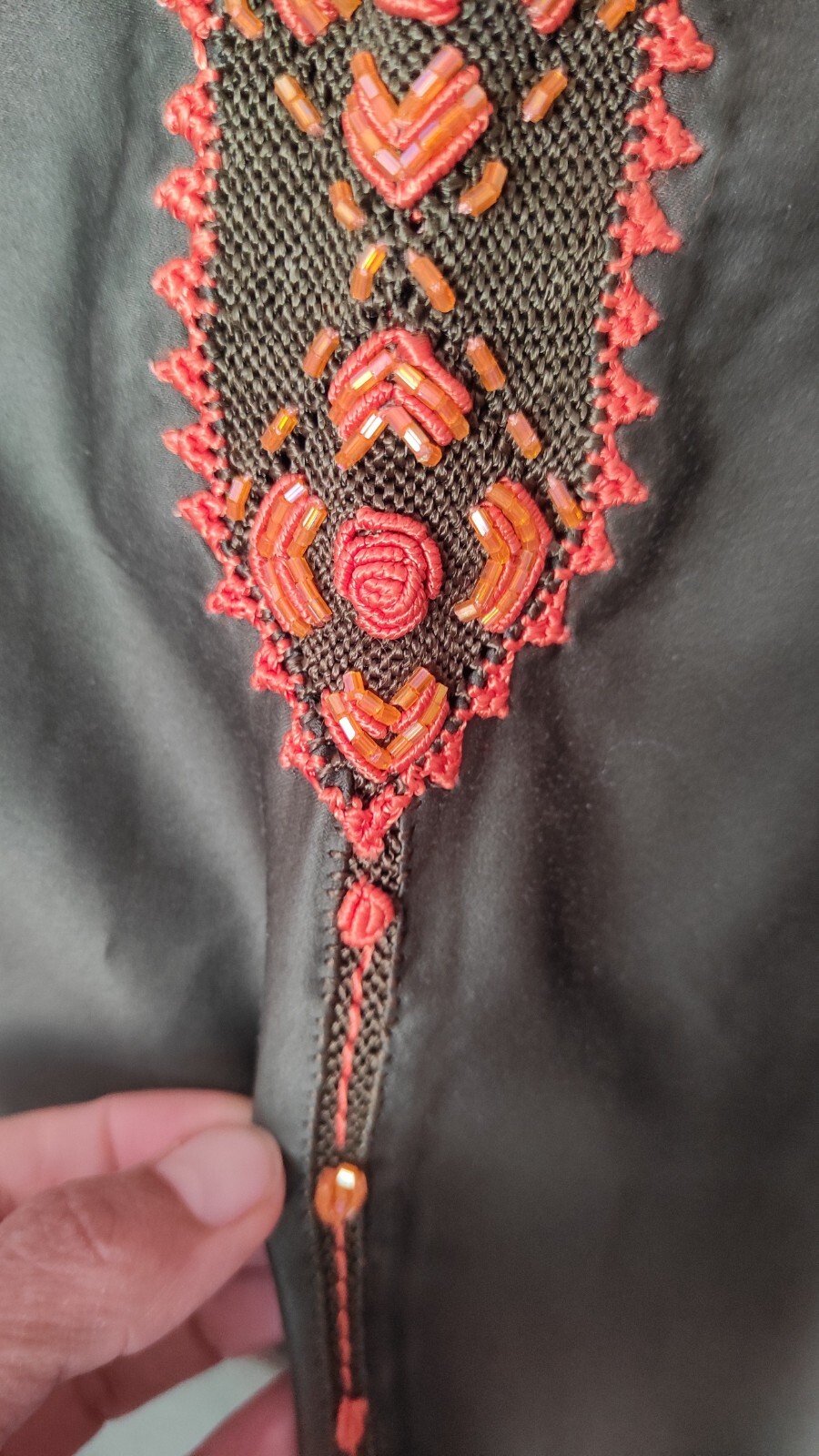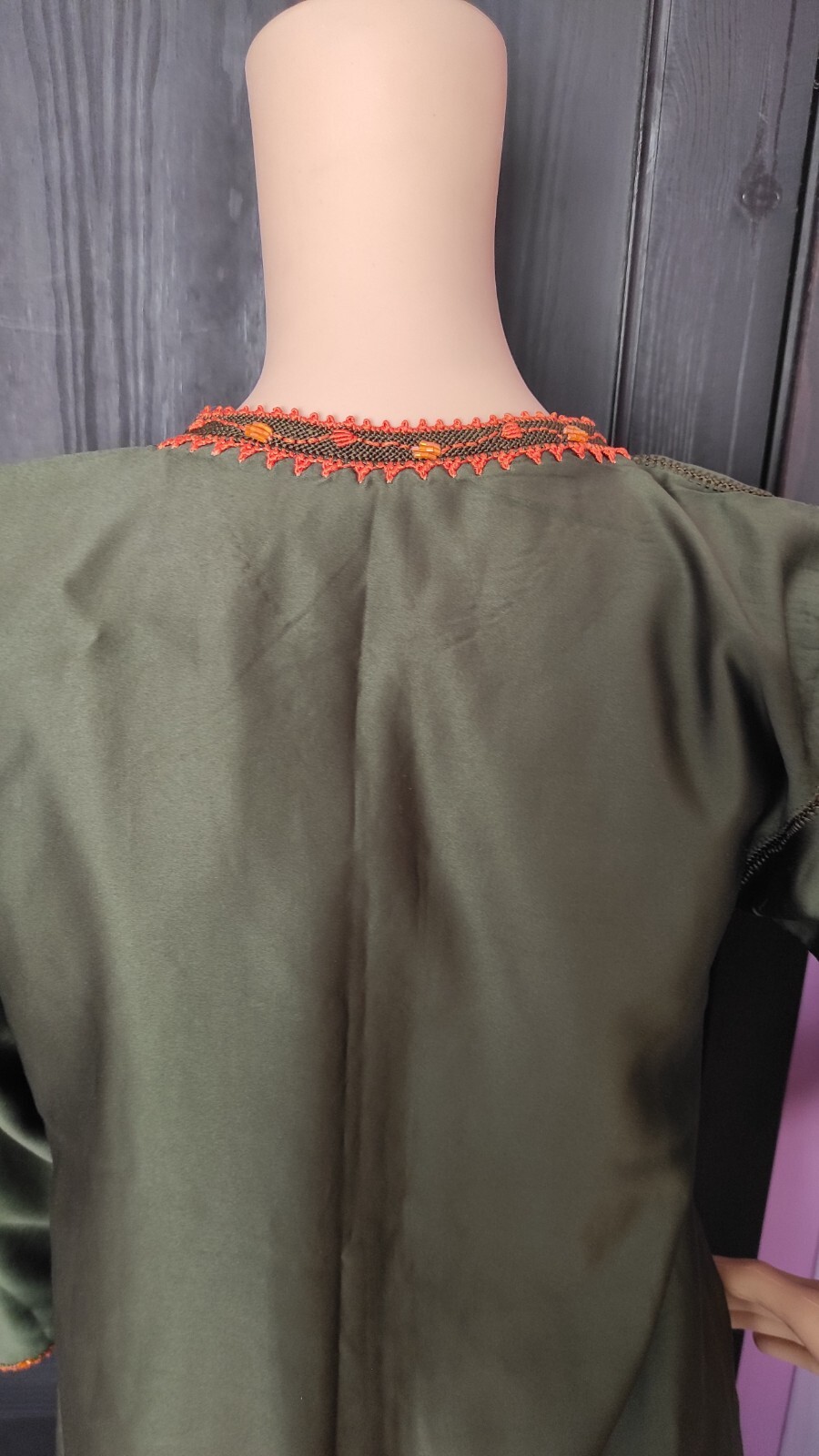 Moroccan Cross Stitch Hand Embroidery Olive Green Hand Crafted Randa Kaftan