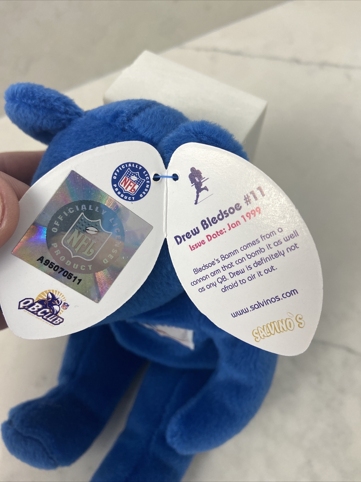 как выглядит Salvinos Bammers NFL Plush Beanie Bear Drew Bledsoe 11 Patriots ERROR фото