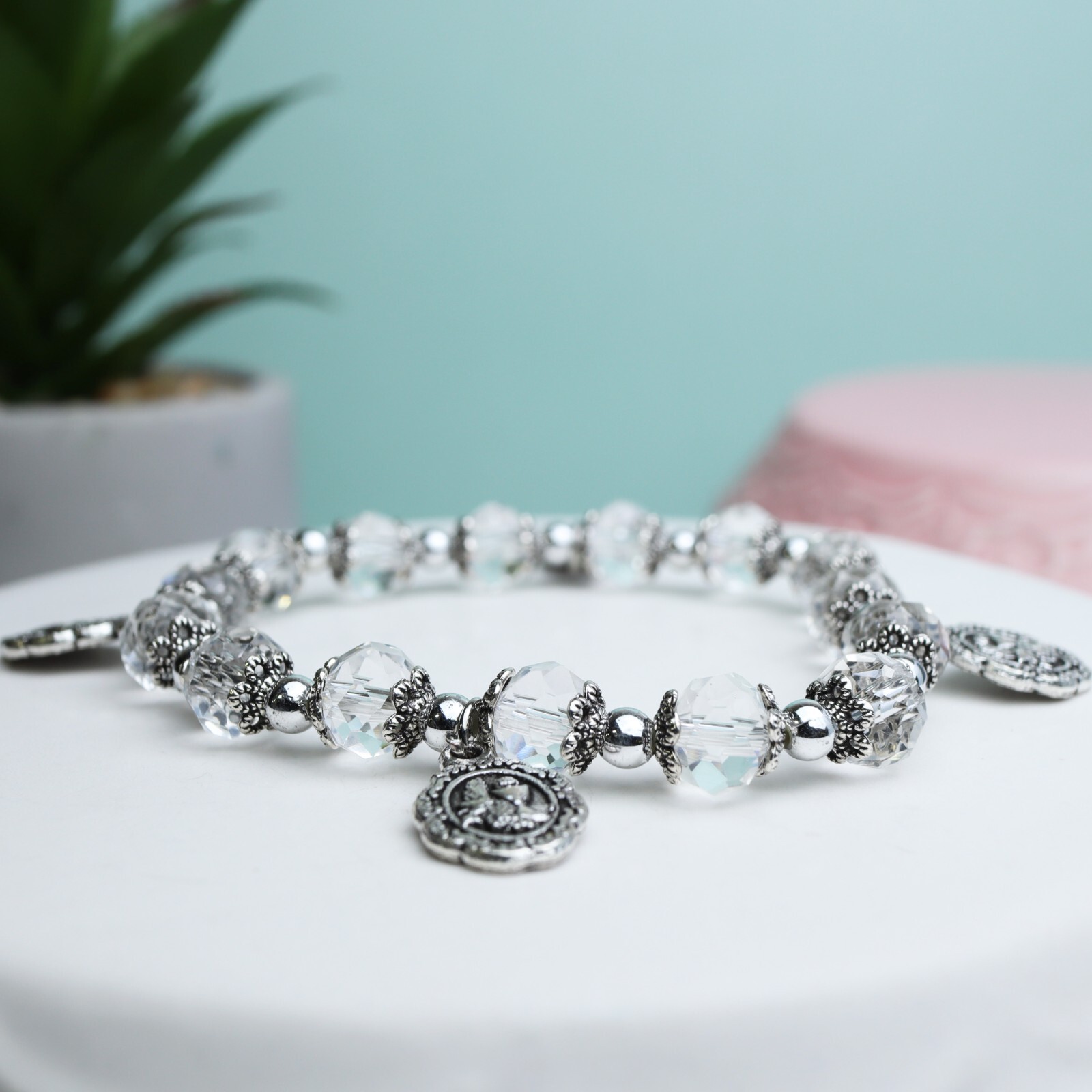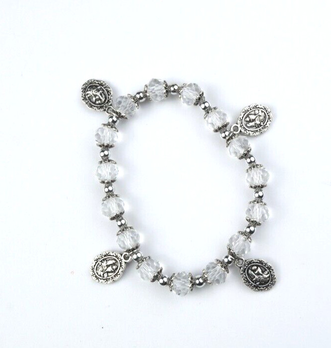 Silver Toned First Communion Medal Prayer Bead Rosary Bracelet Gift 6.5 In
