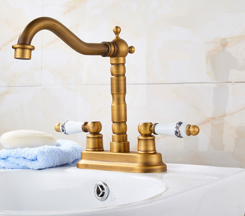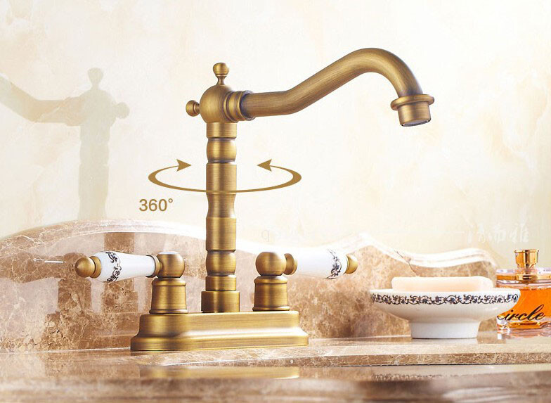 как выглядит Antique Brass Two-hole Deck Mount Bathroom Sink Faucet Basin Swivel Taps 2nf425 фото