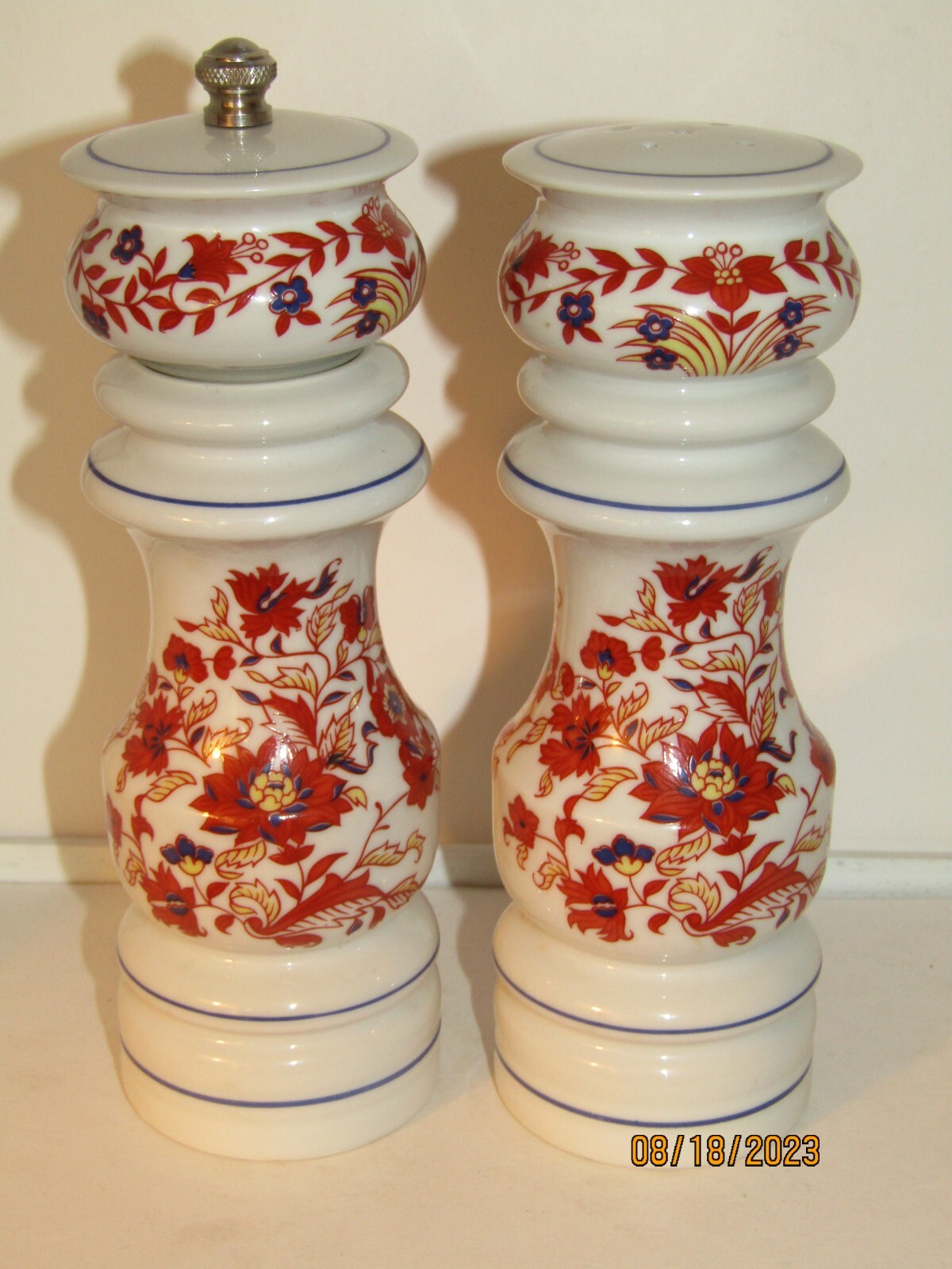 Vtg Salt Shaker Pepper Mill Woodcrest By Styson 7" Floral design Porcelain