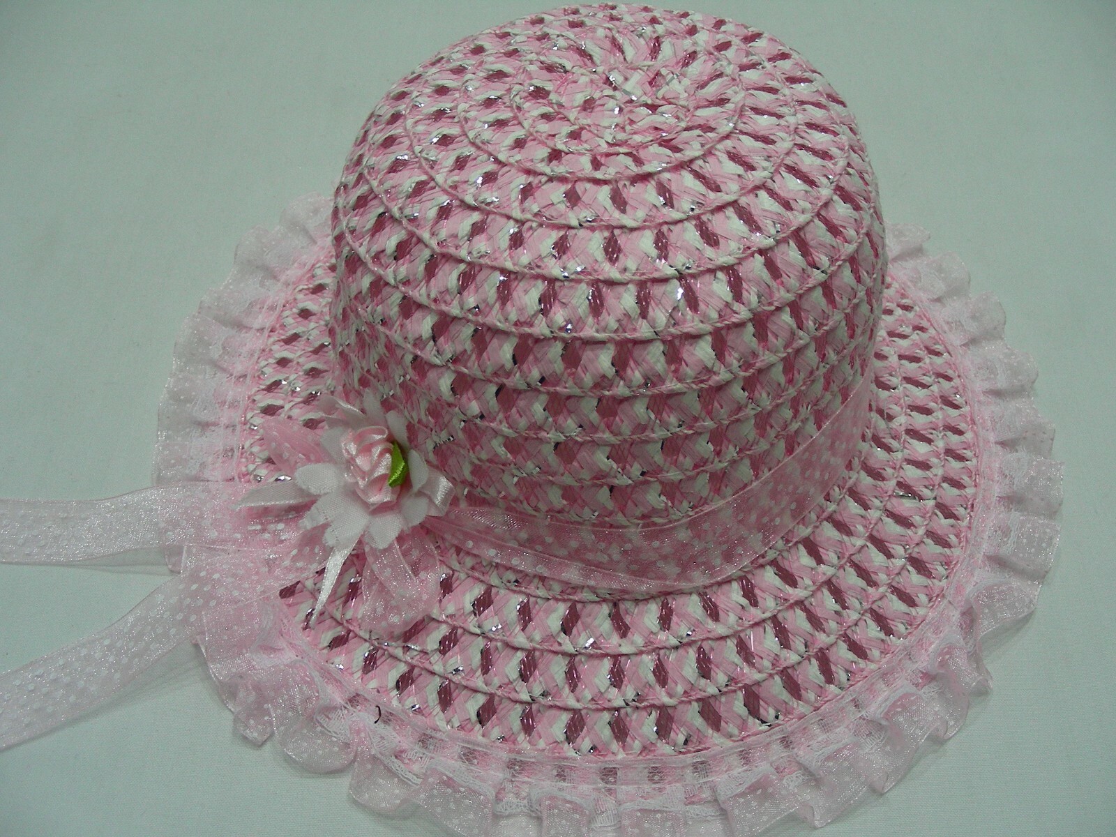 как выглядит Pink and White with Silver Strands - Girls One Size 50cm Floppy Style Sun Cap фото