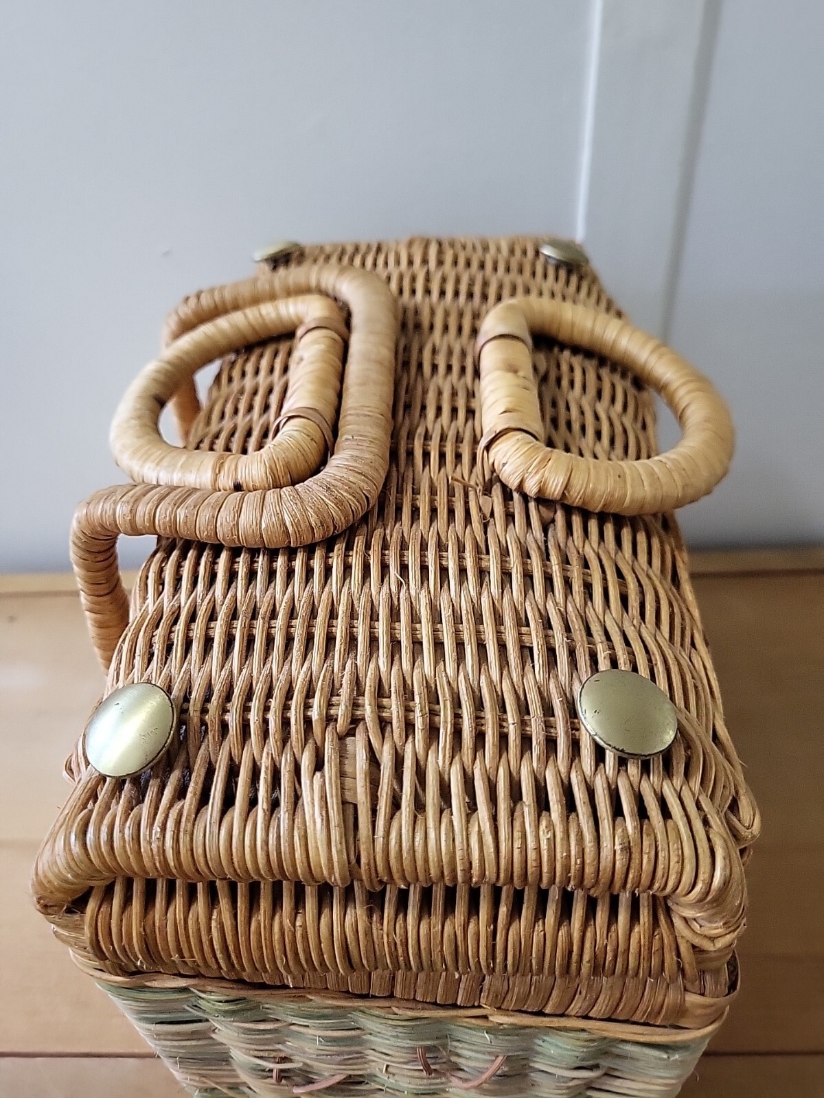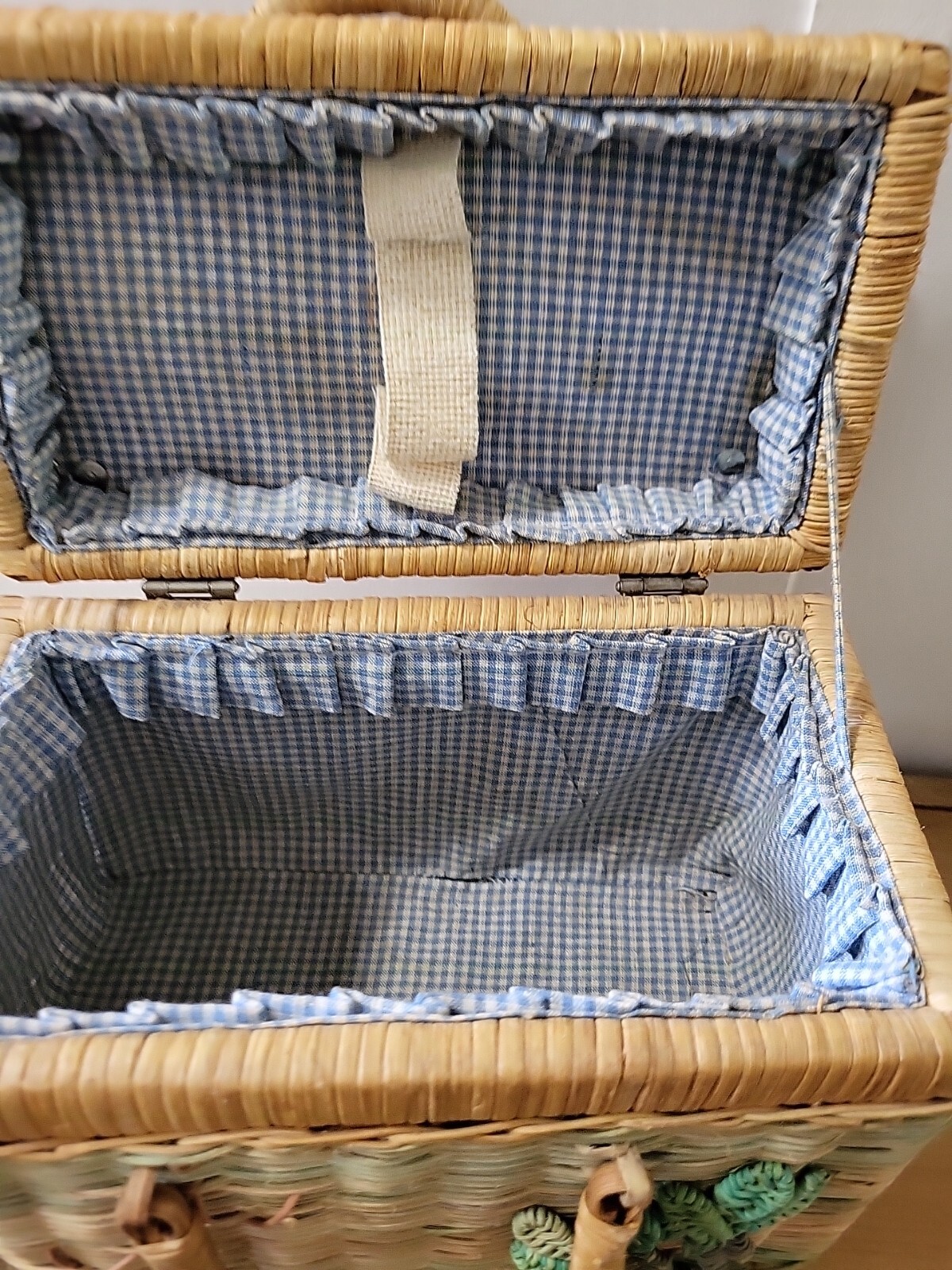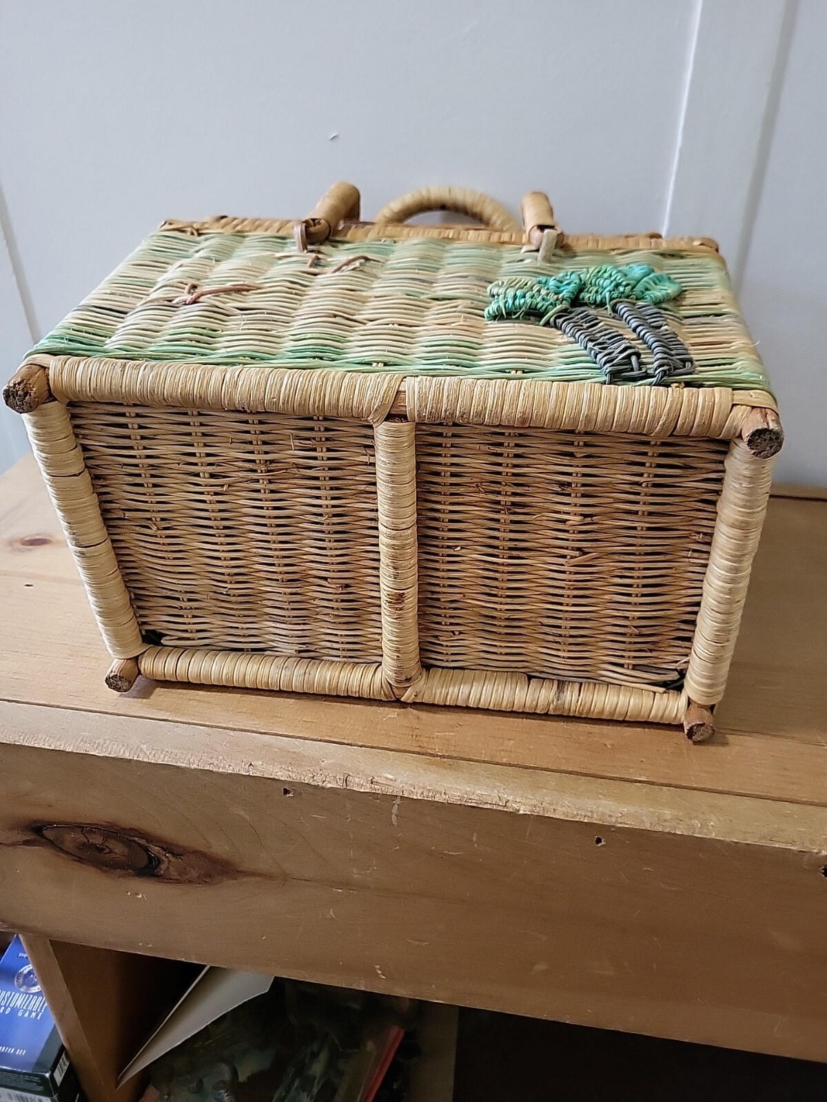 как выглядит Vtg 60s Wicker Basket Purse Sewing Picnic Palm Trees 10x8x6 фото