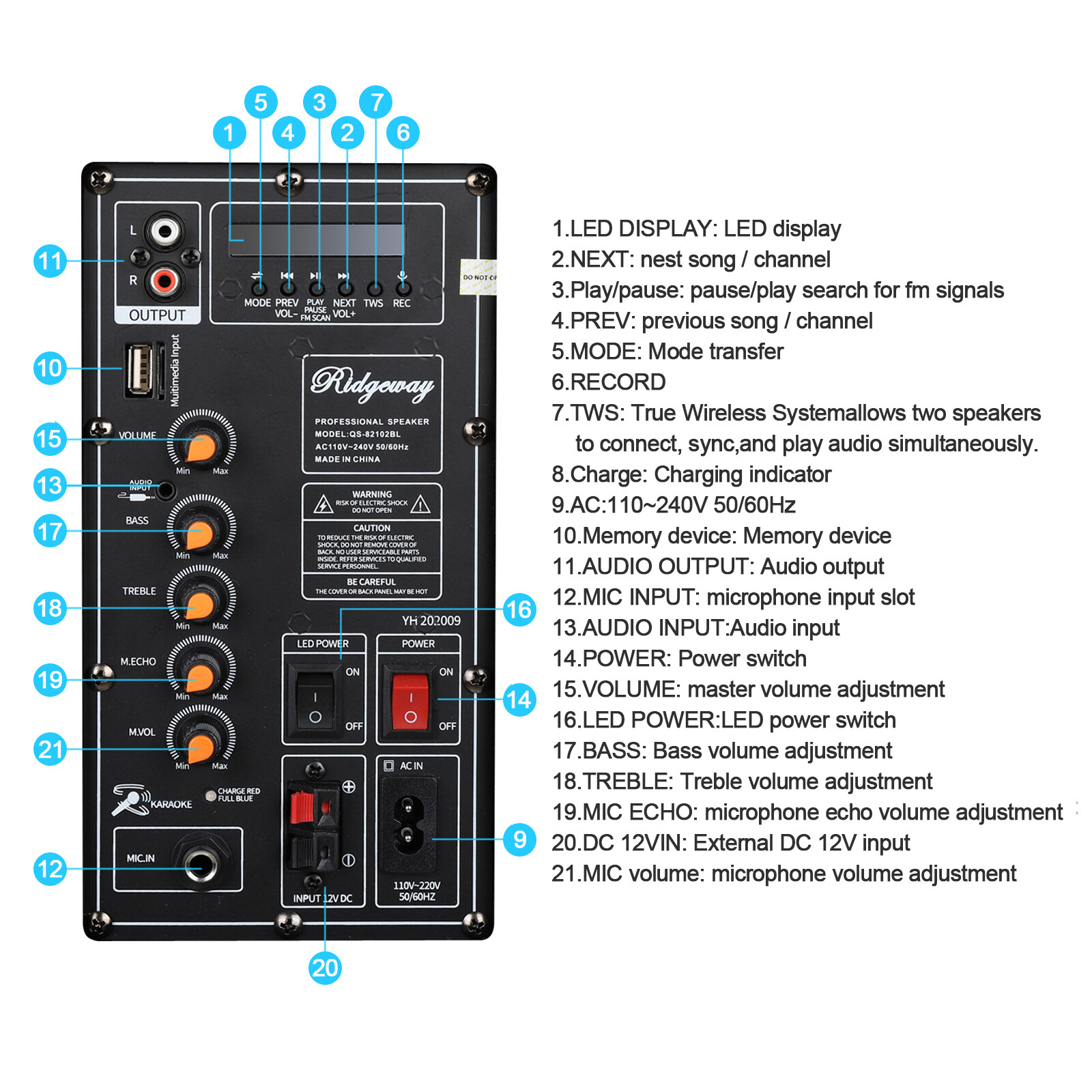 Особенности: Bluetooth, Weatherproof, Portable, Remote Control, Built-in Rechargeable Battery, With Trolley Wheels, With Extention Handle, With LED Light, With LED Display, Wireless, Super loud
