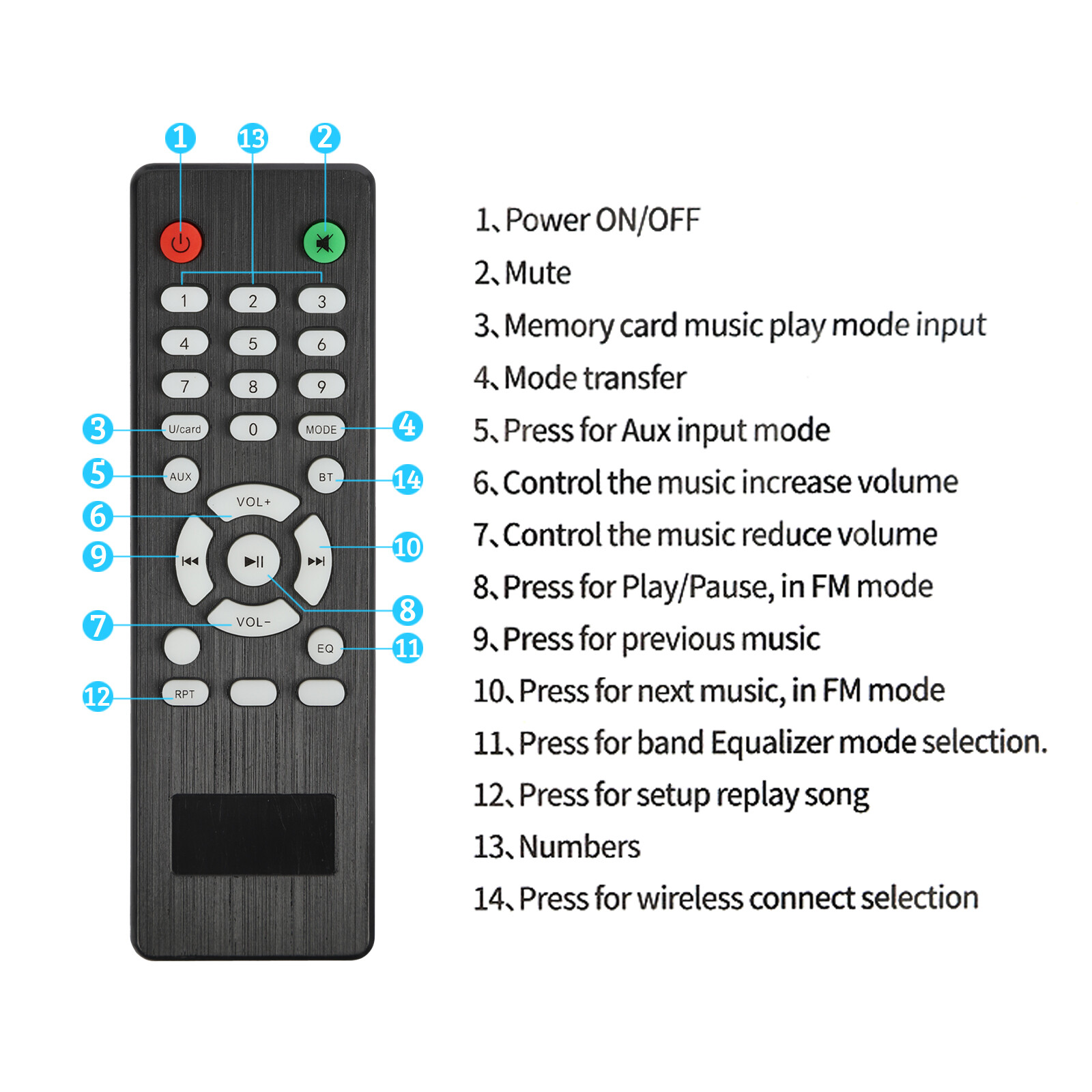 Audio Inputs: AUX, Memory Card, FM, BT