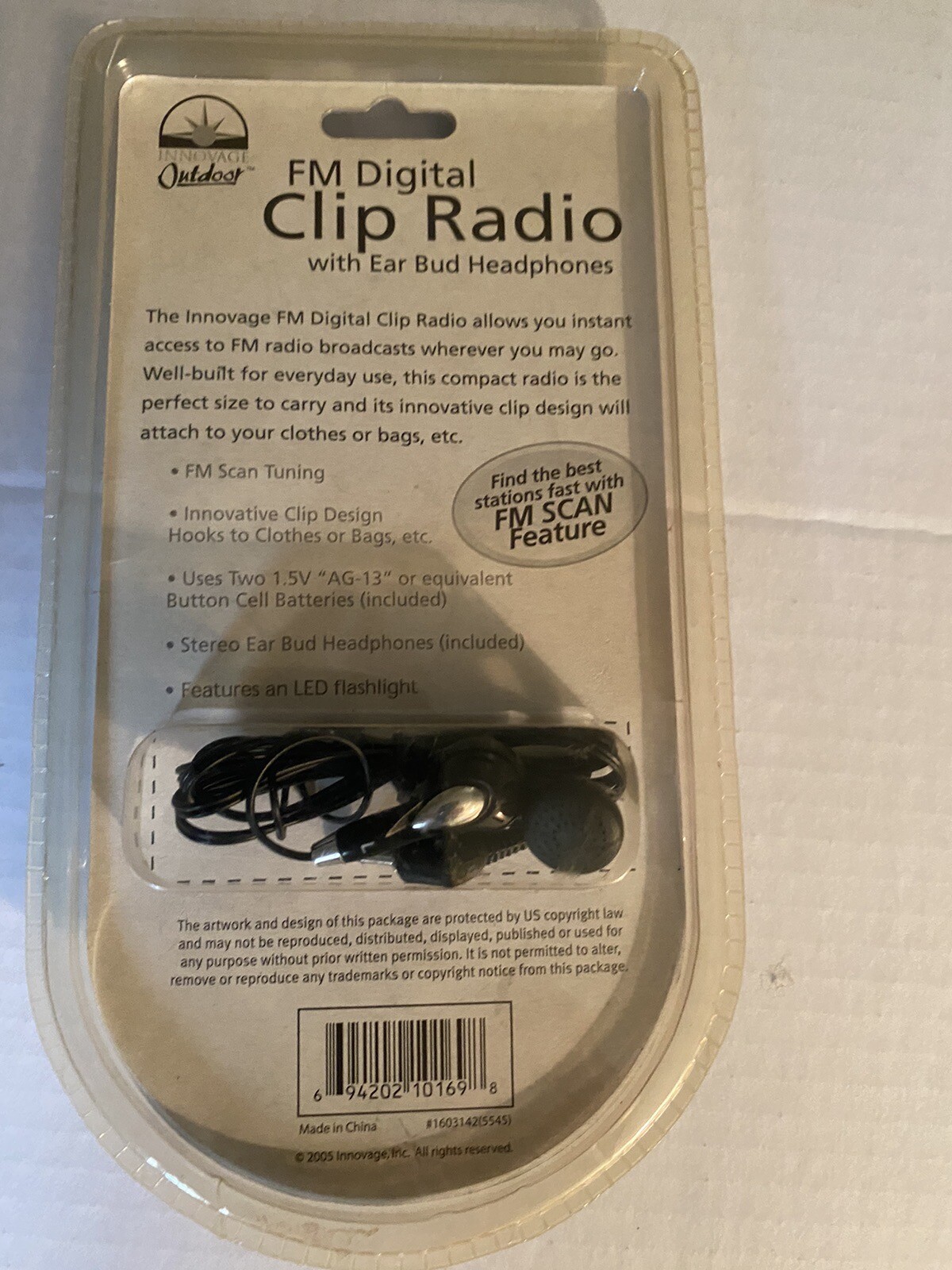 Innovage Outdoor FM Digital Clip Radio w/Ear Bud Headphones LED Light Silver