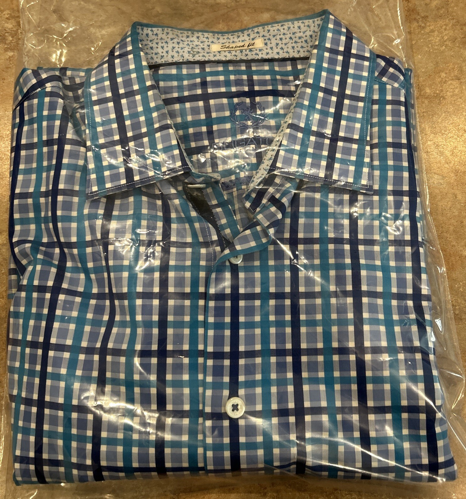 Bugatchi Uomo Button Shirt LS Blue Check Contrast Cuff Men Size Large 46 Chest
