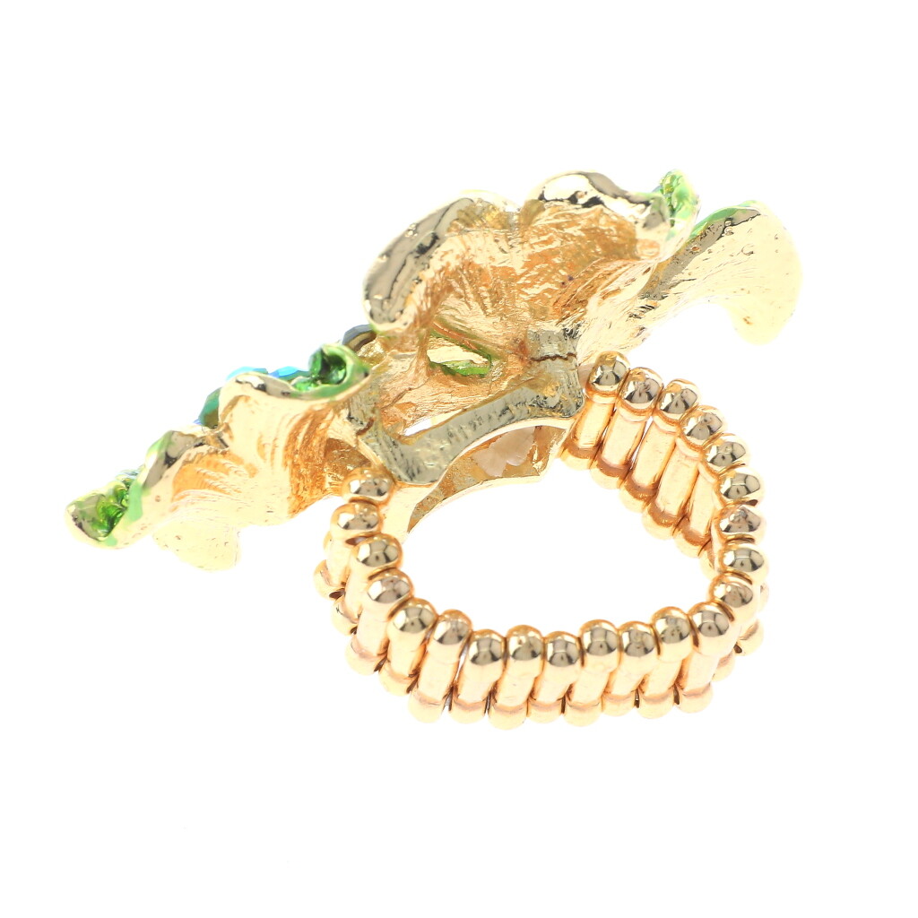 как выглядит Gold Tone Stretch Metal Flower Ring With Crystal Rhinestone R1256-GRN фото