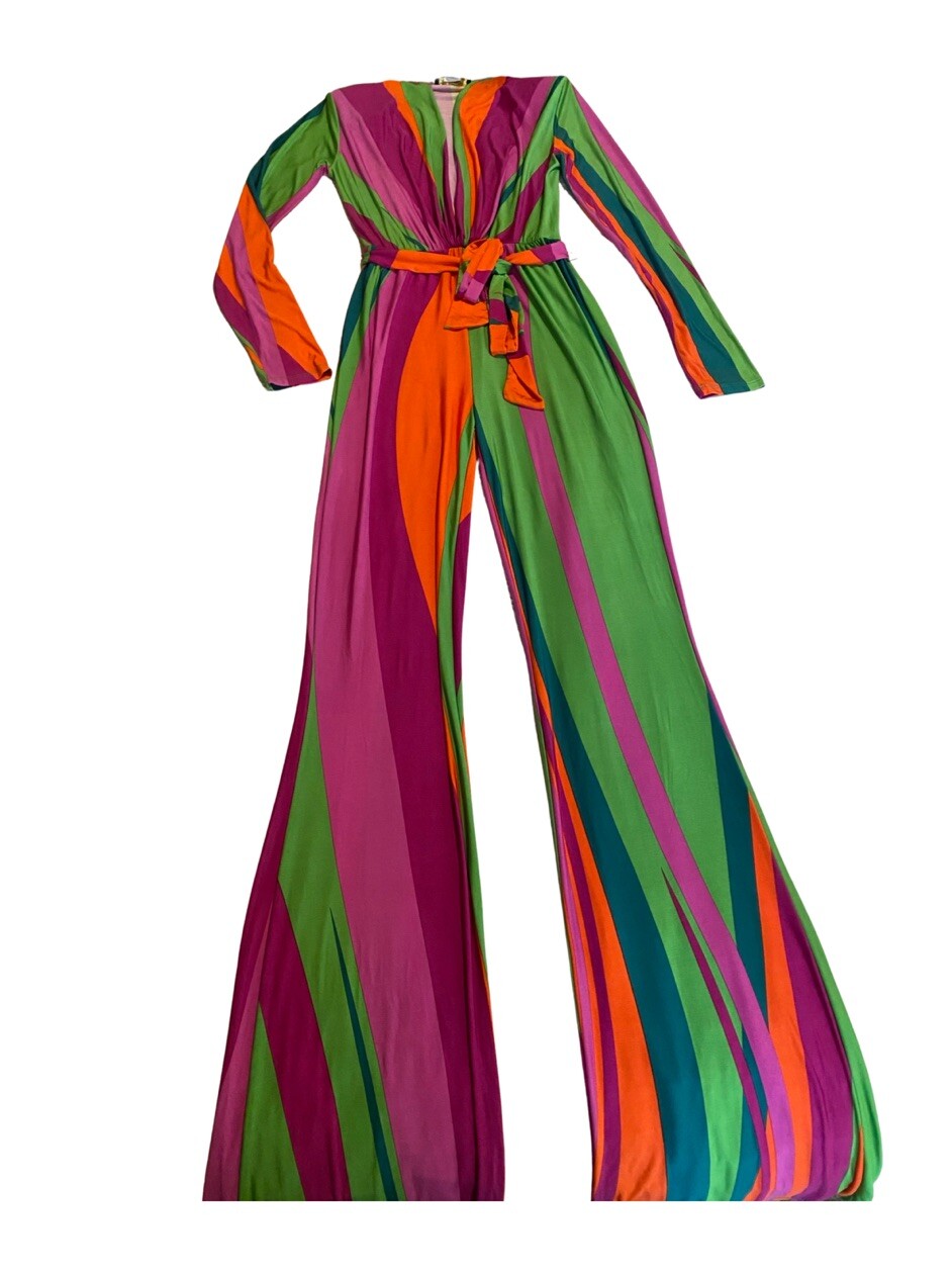 как выглядит DEEP V NECK SHOULDER PAD PATTERN PRINT LONG SLEEVE JUMPSUIT фото