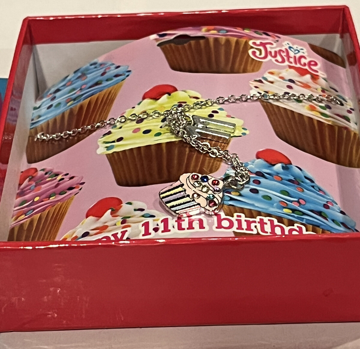 Girls 11th Birthday Enamel Rhinestone Cupcake Necklace Silvertone 11 Charm
