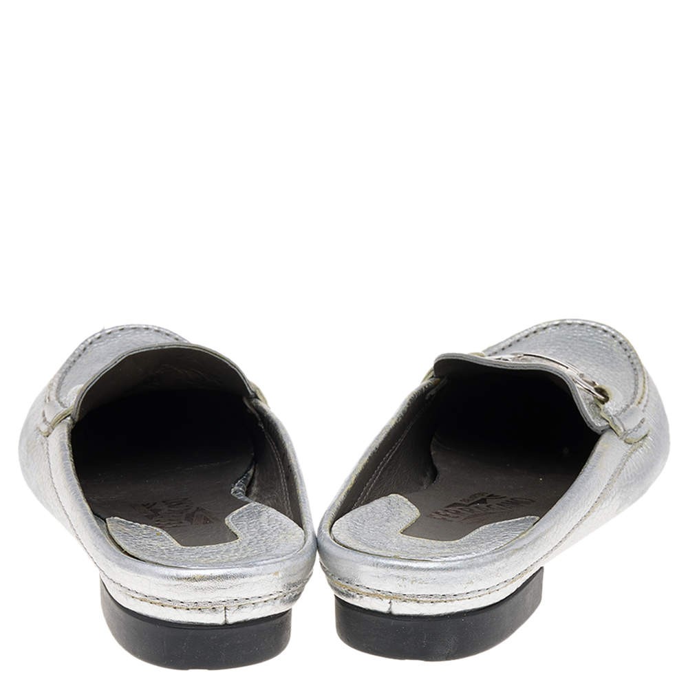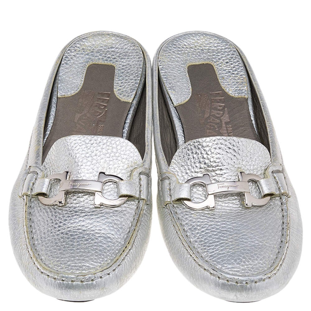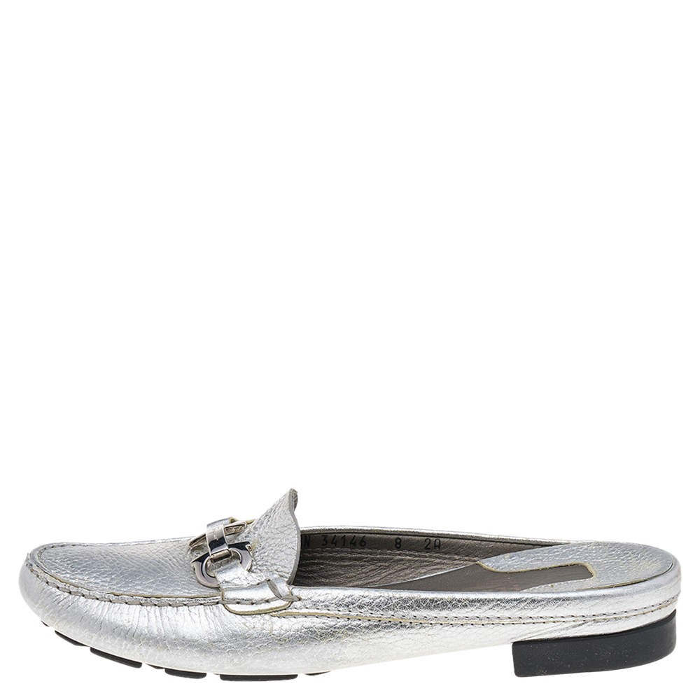 Salvatore Ferragamo Silver Leather Gancini Slip On Mules Size 38.5