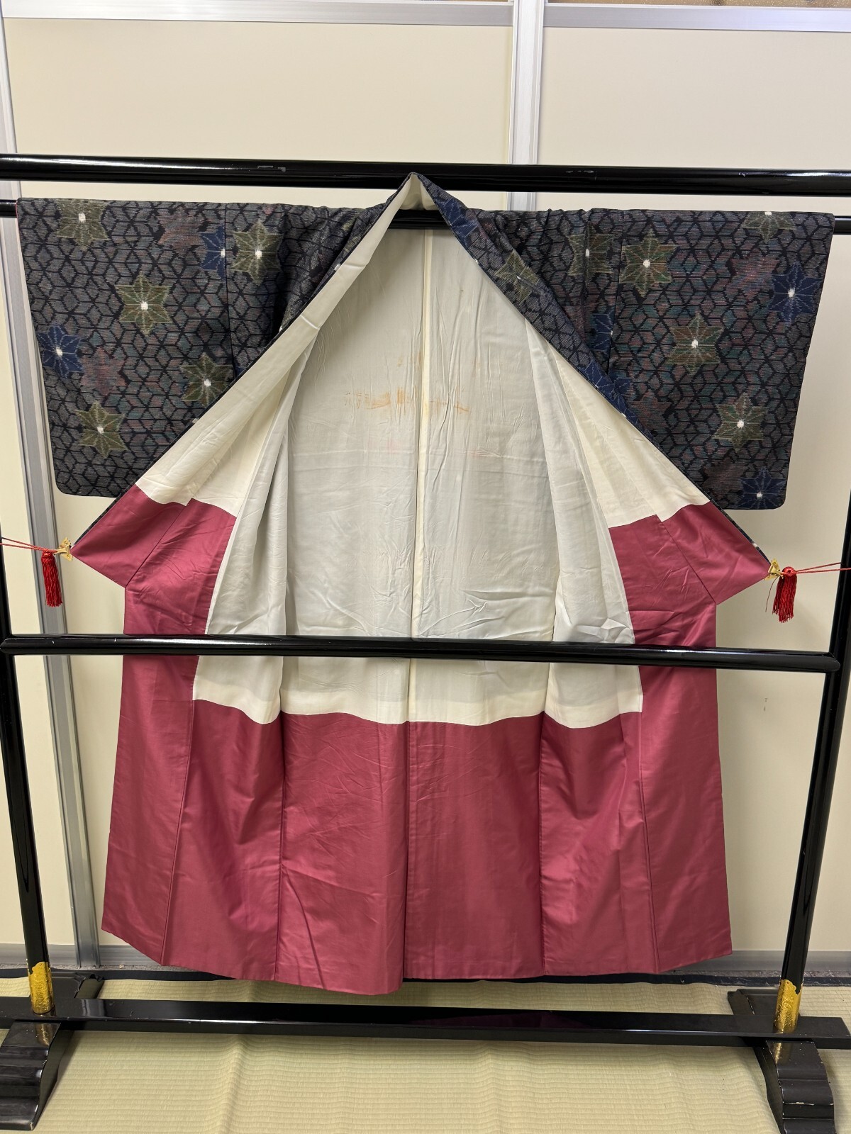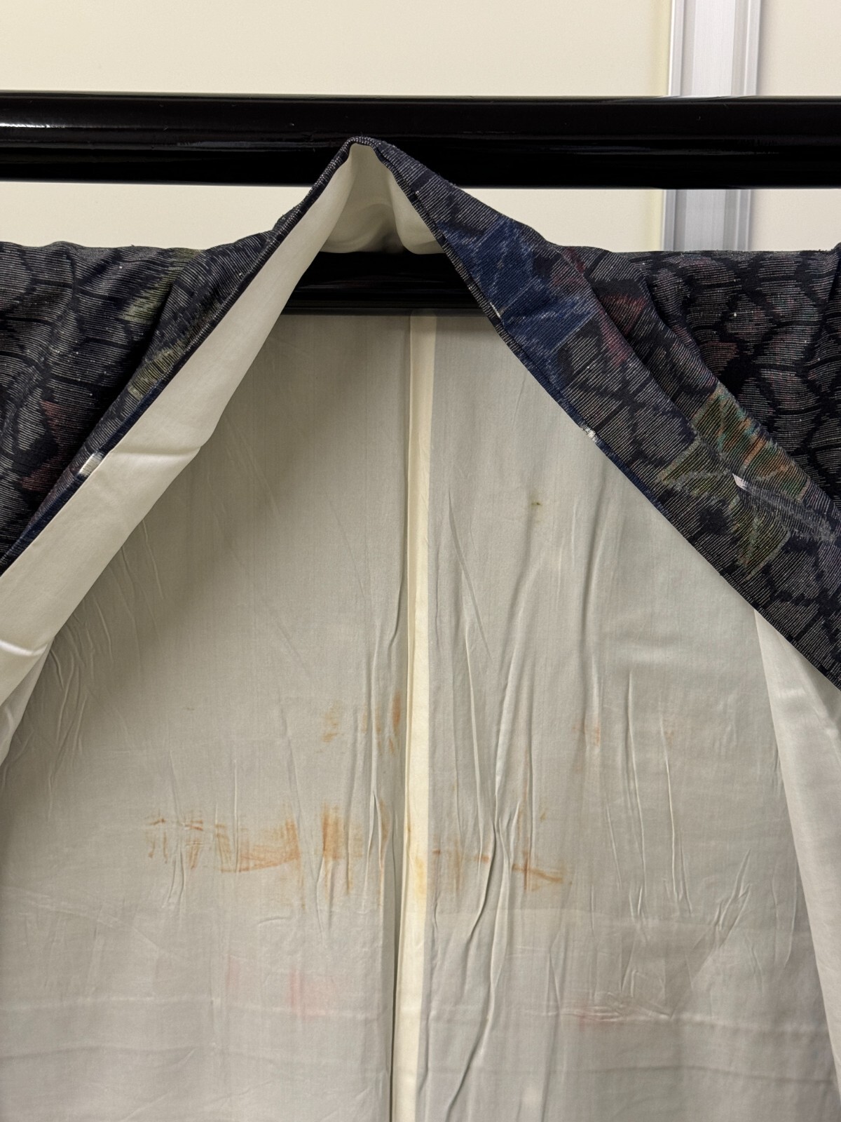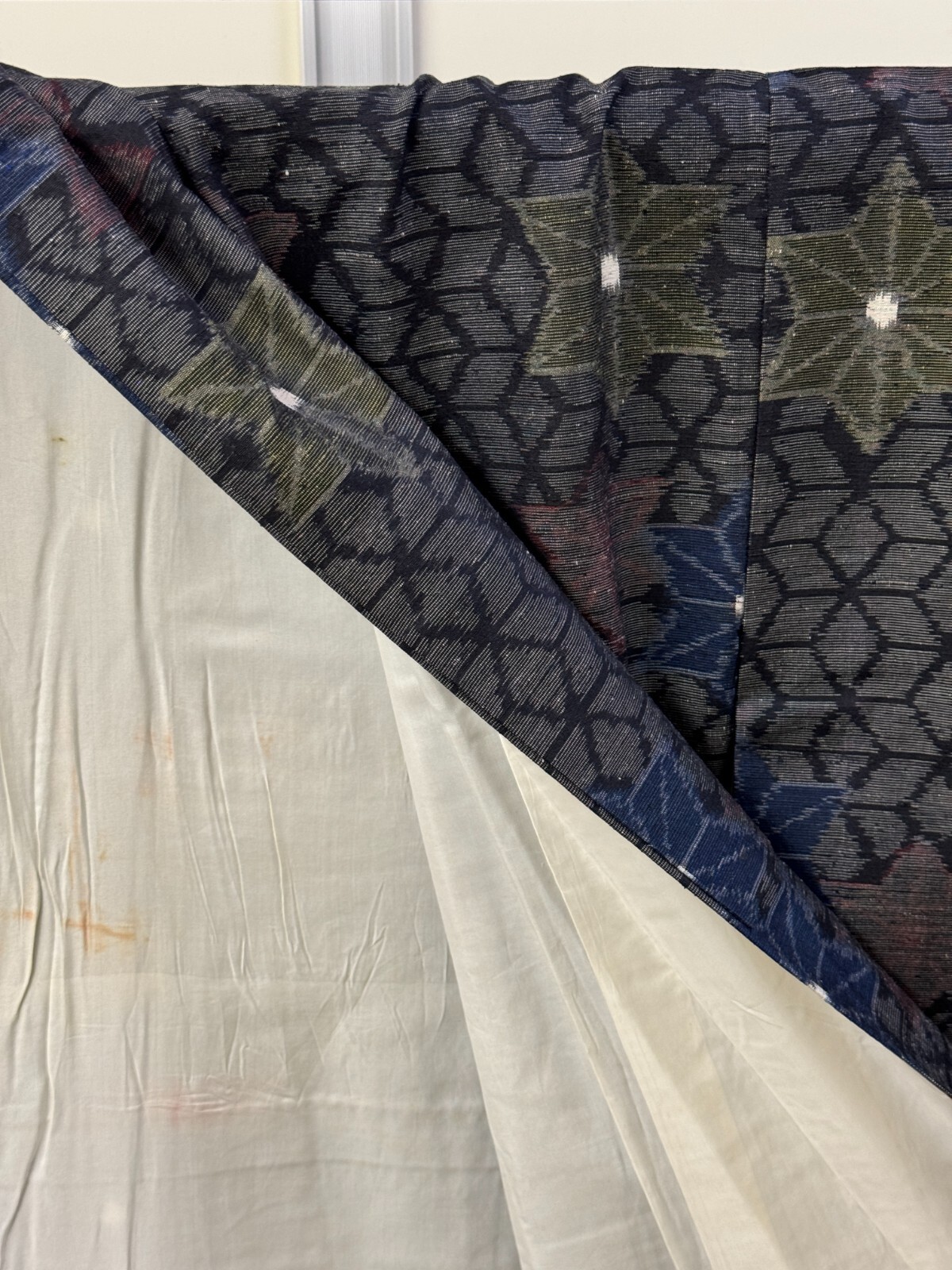 Japanese Vintage Kimono Pure Silk Black Blue Expensive Tsumugi Dirt Height 57in