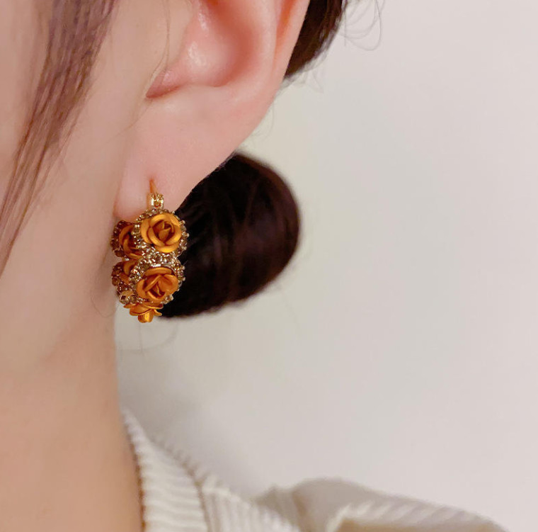 Women Gold Tone Champagne Rose Flower Hoop Earrings Exquisite Lightweight PE65