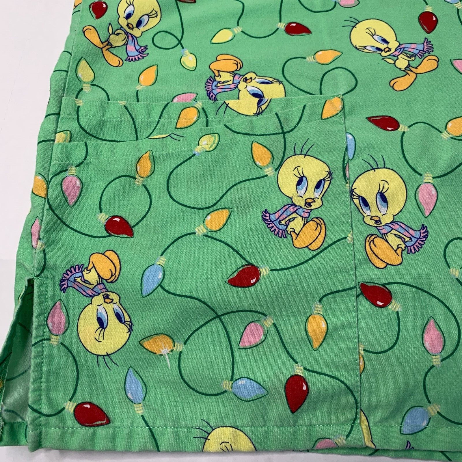 Tweety Bird Chirstmas Lights M 8-10 Double Pockets V Neck Scrub Top