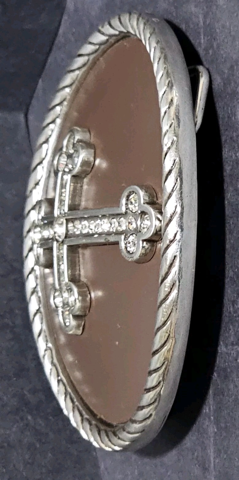 • Nocona Belt Buckle Cross Rhinestone Western Brown And Silver Tone Rope Edge