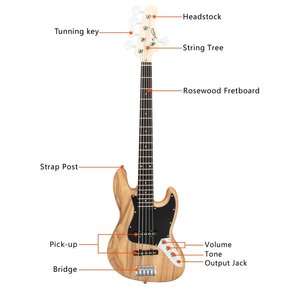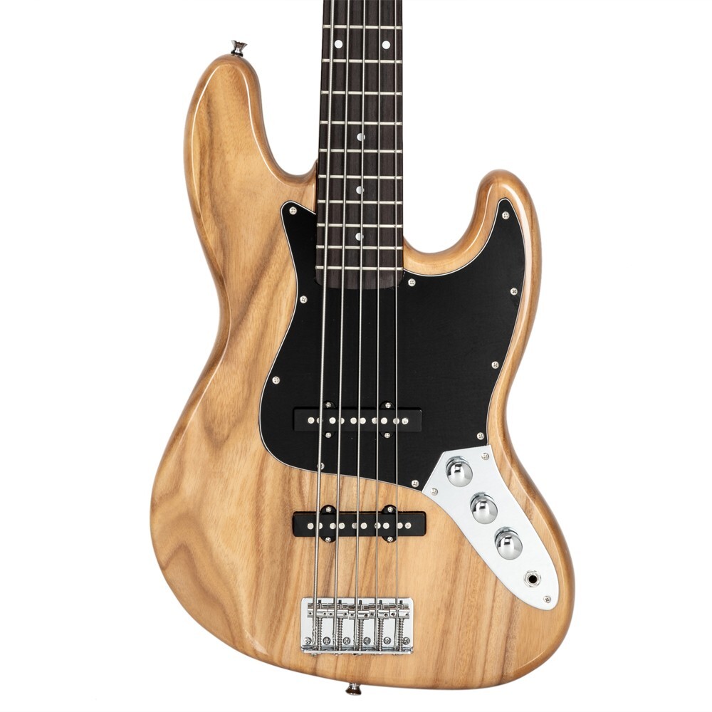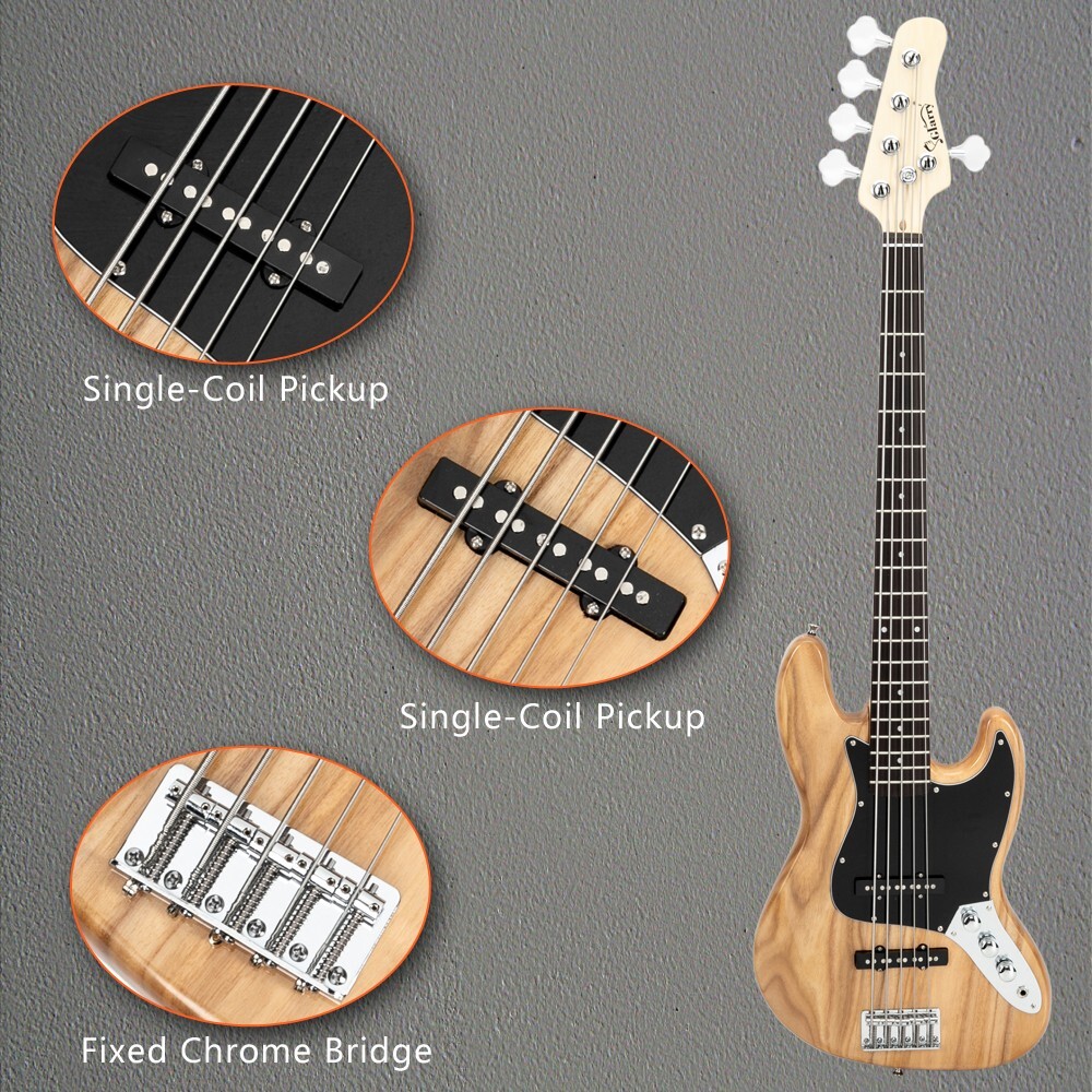 Natural 5-String Electric Jazz Bass Guitar, with Gig Bag and Accessories