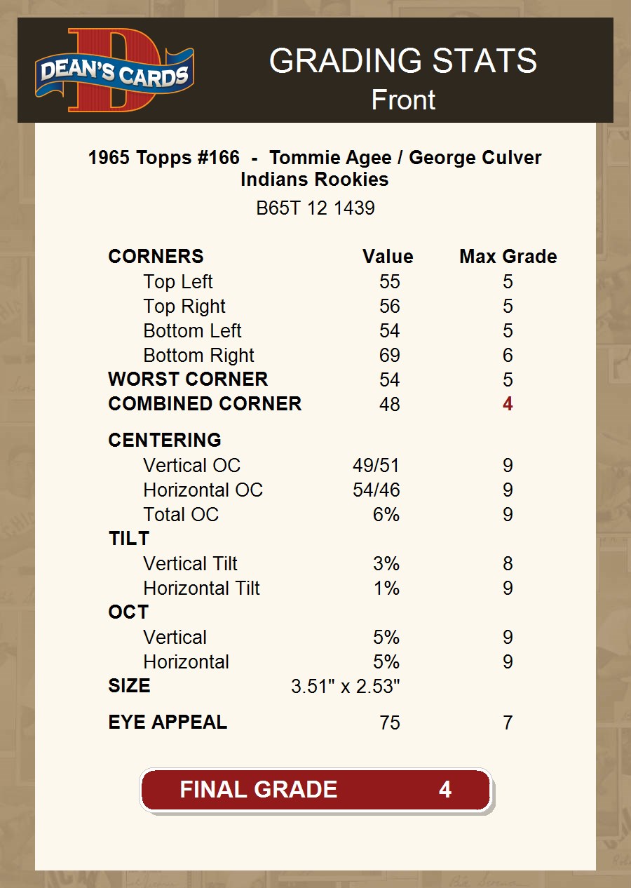 как выглядит 1965 Topps 166 Tommie Agee / George Culver Indians RCs RC 4 - VG/EX фото