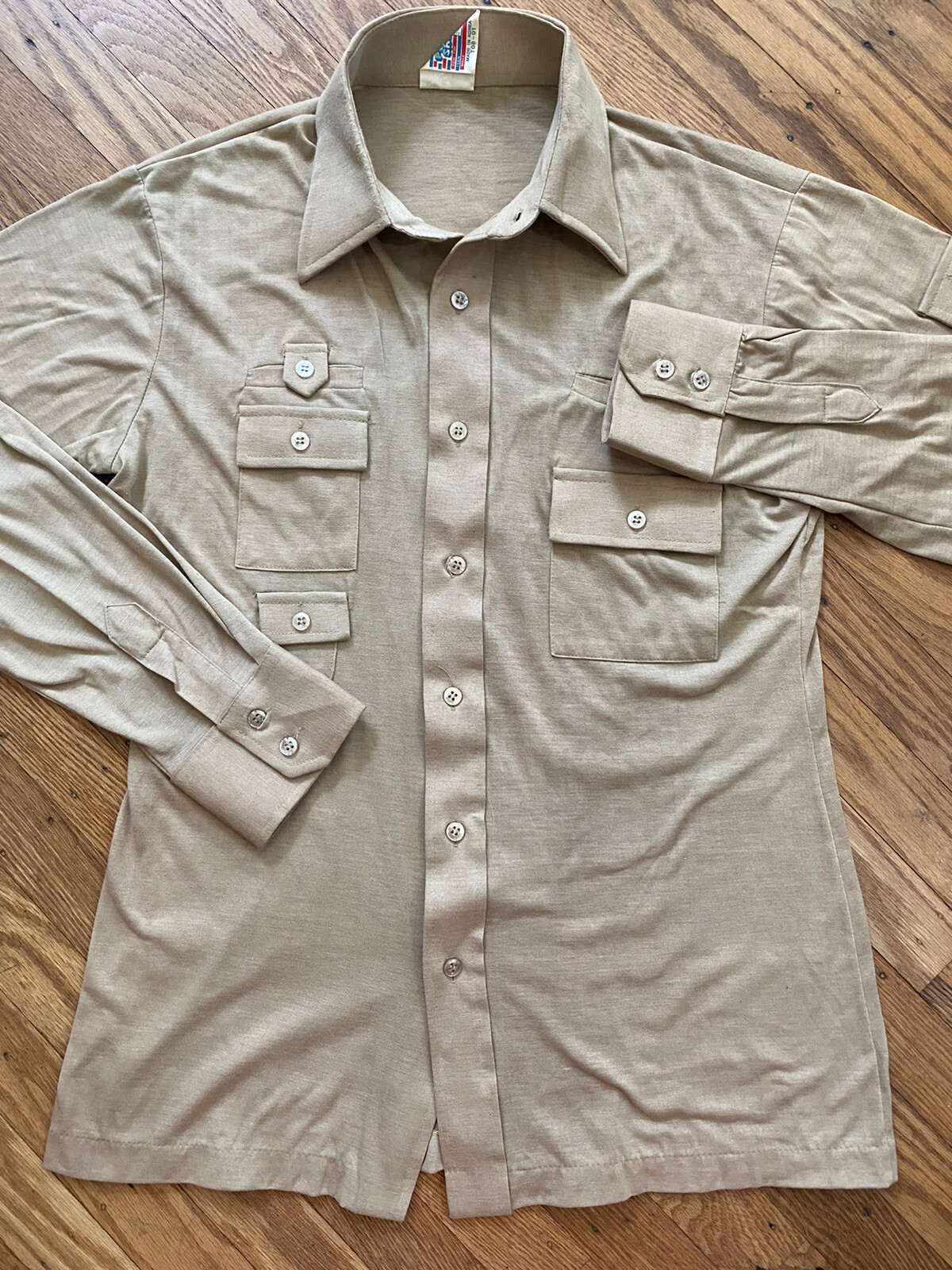 как выглядит Vintage 70s Men s SEARS disco safari shirt.crazy Buttons.small/tan.made korea. фото