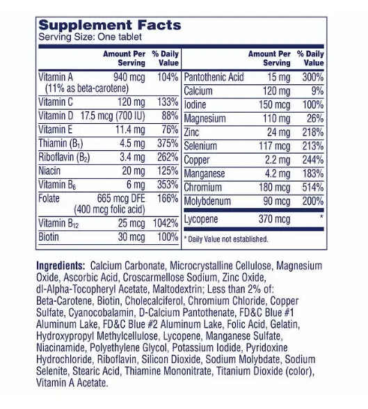 Active Ingredients: Beta-Carotene, Calcium, Calcium Carbonate, Iron, Vitamin B12, Zinc, Lycopene, Vitamin C (Ascorbic Acid), Vitamin B2 (Riboflavin), Vitamin A, Vitamin D, Vitamin B1 (Thiamine), Magnesium, Vitamin B6, Vitamin K