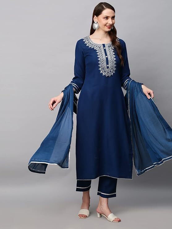 как выглядит Women Navy Blue Plus Size Embroidered Indian Kurta Top And Trousers With Dupatta фото