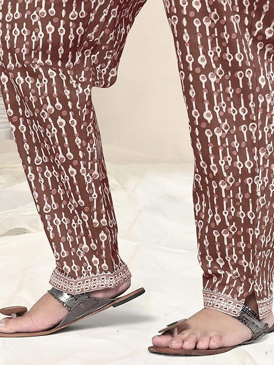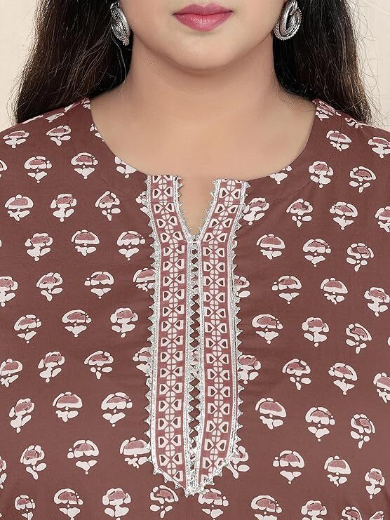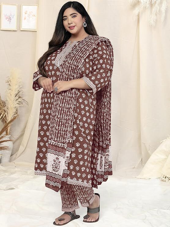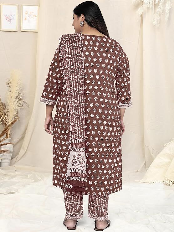 как выглядит Women Brown Plus Size Block Printed Indian Cotton Kurta Top Trouser With Dupatta фото