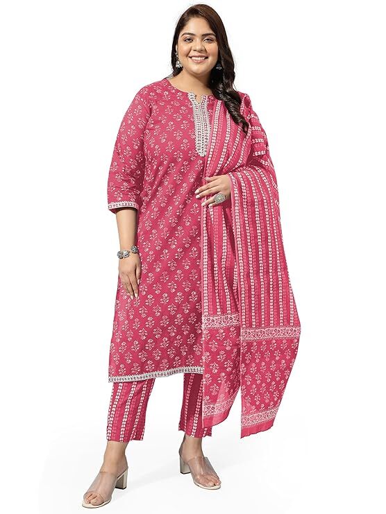 Women Pink Plus Size Block Printed Indian Cotton Kurta Top Trouser With Dupatta