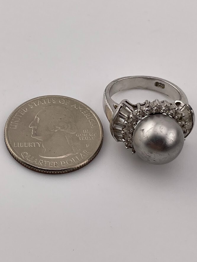 как выглядит 925 STERLING SILVER 12MM GRAY FAUX PEARL CZ RING SIZE 7 COCKTAL ROUGH FINISH 287 фото