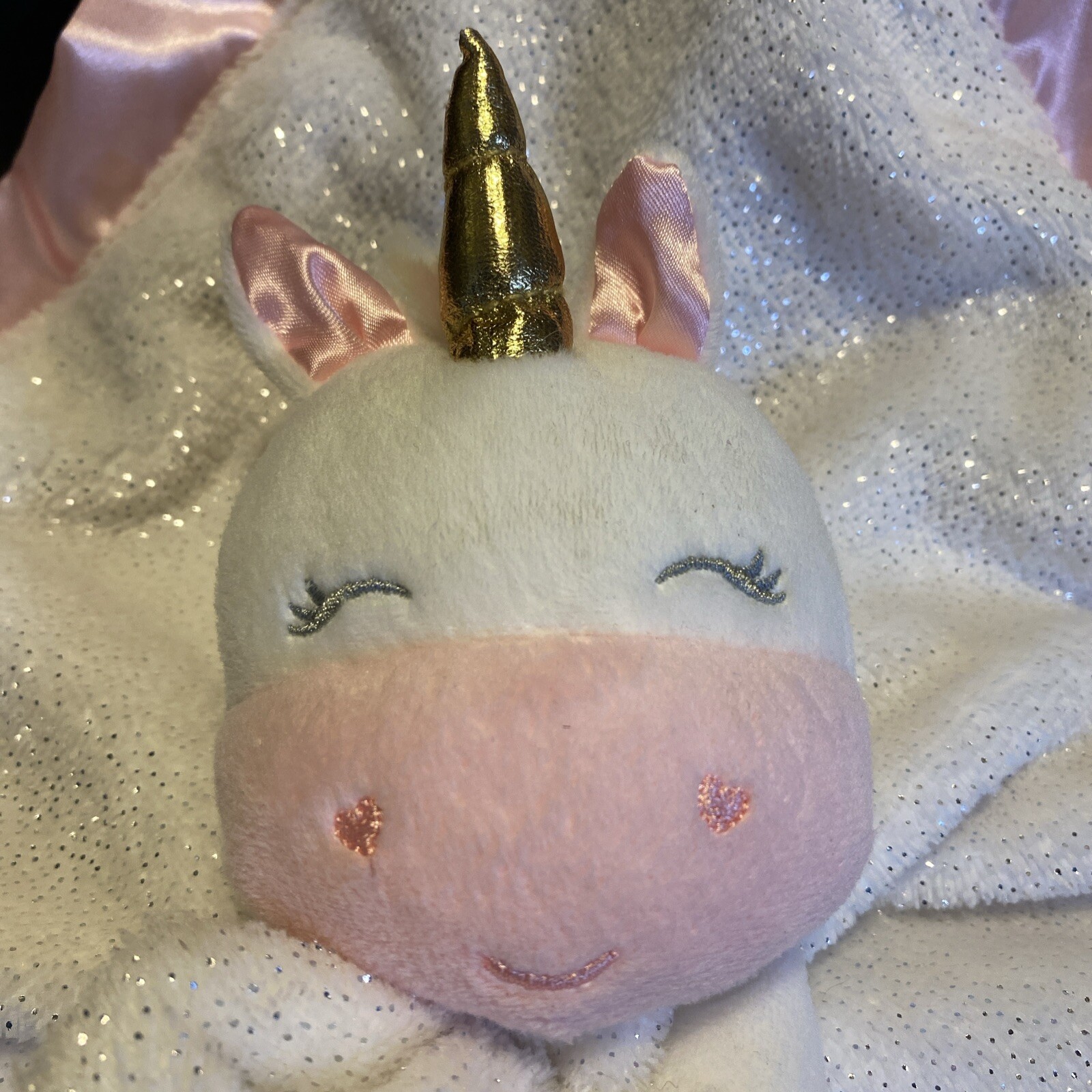 как выглядит Baby Starters Unicorn Blanket Lovey White Pink Satin Trim Rainbow Believe Glitte фото