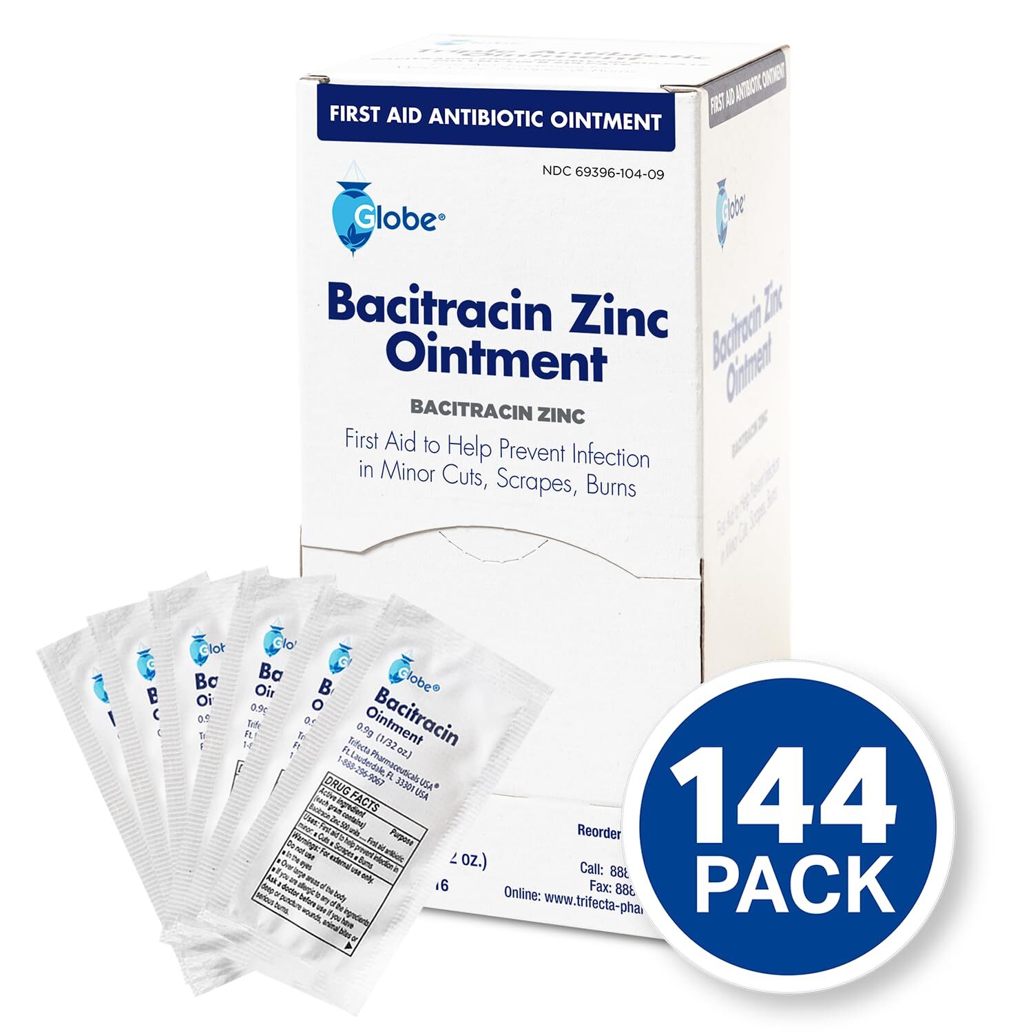 Globe 144 Packets Bacitracin Antibiotic Zinc Ointment 0.9g Packet. First Aid ...