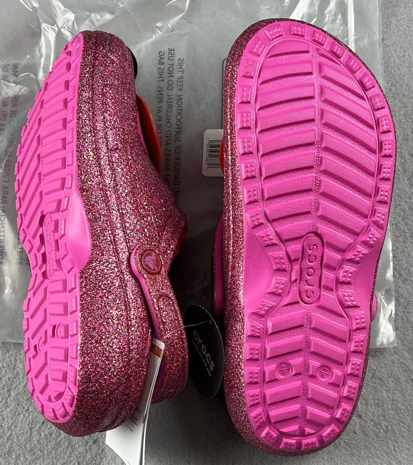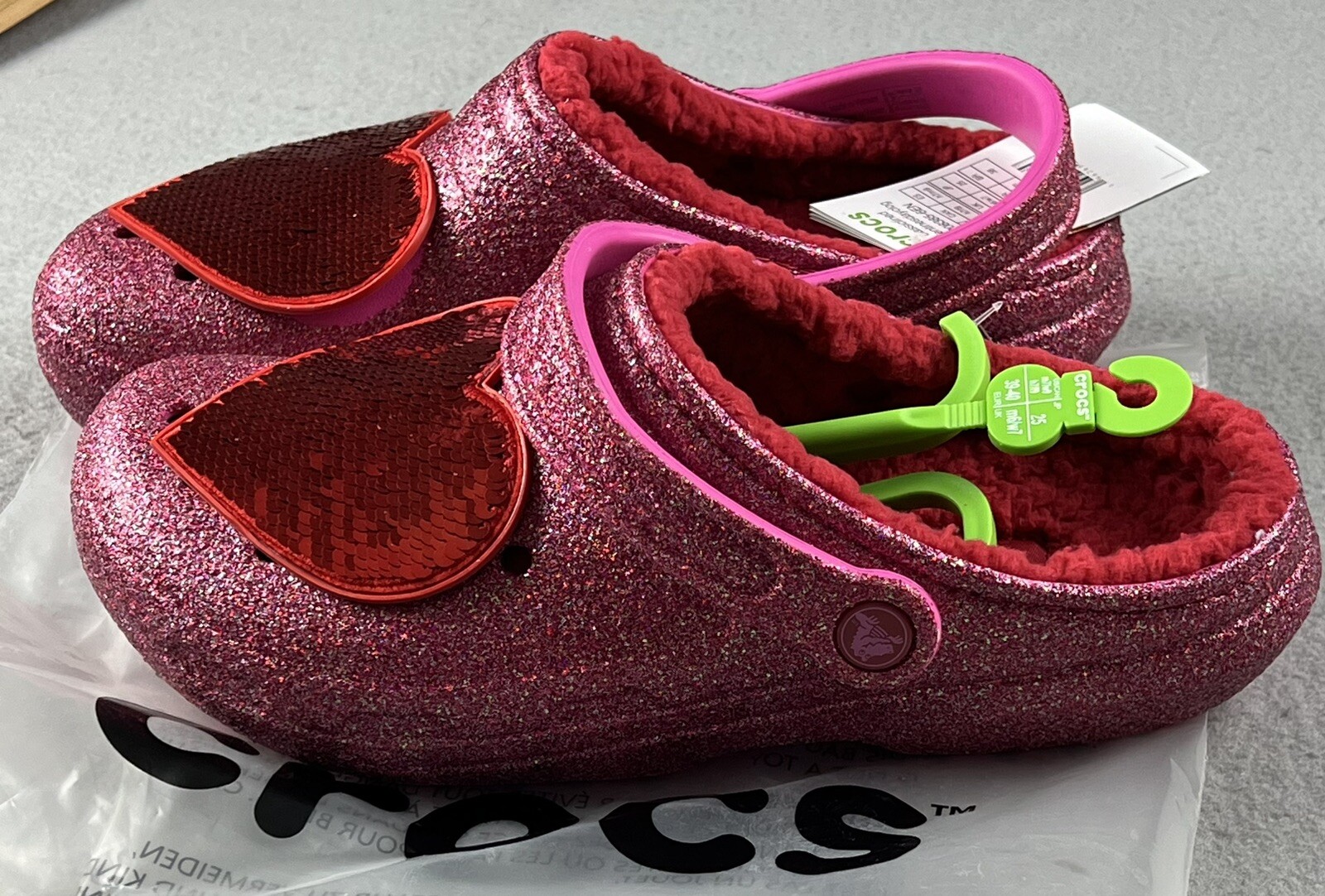 CROCS Classic Lined Pink Glitter Heart Clog Valentine's Day Sequin Sz Women s 9