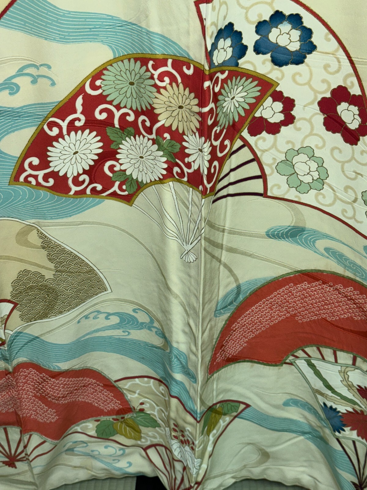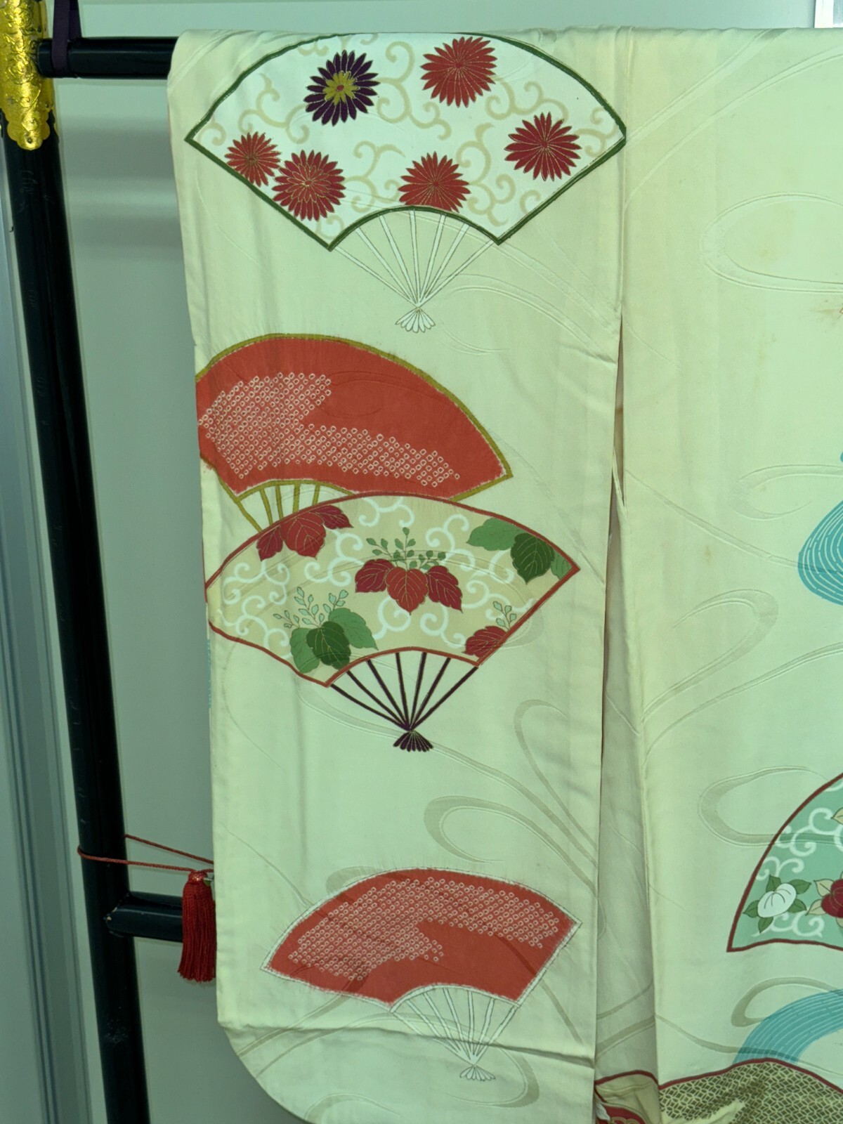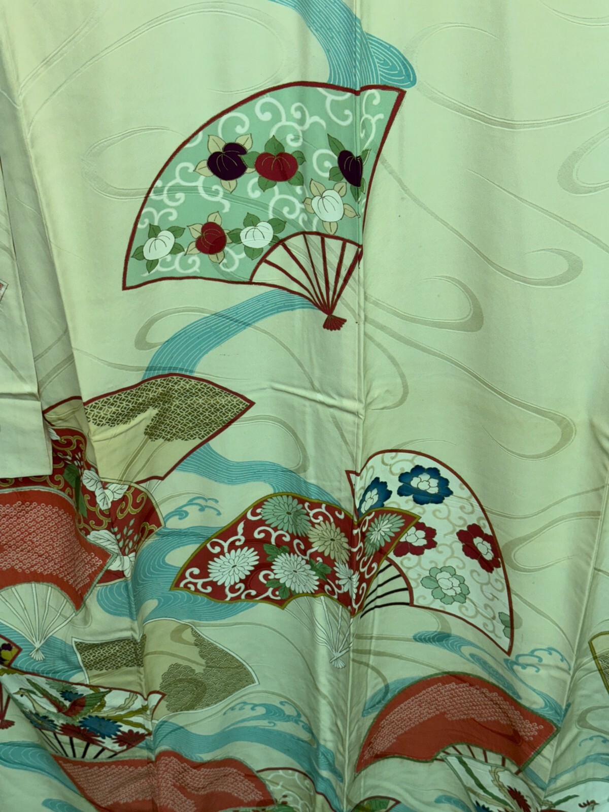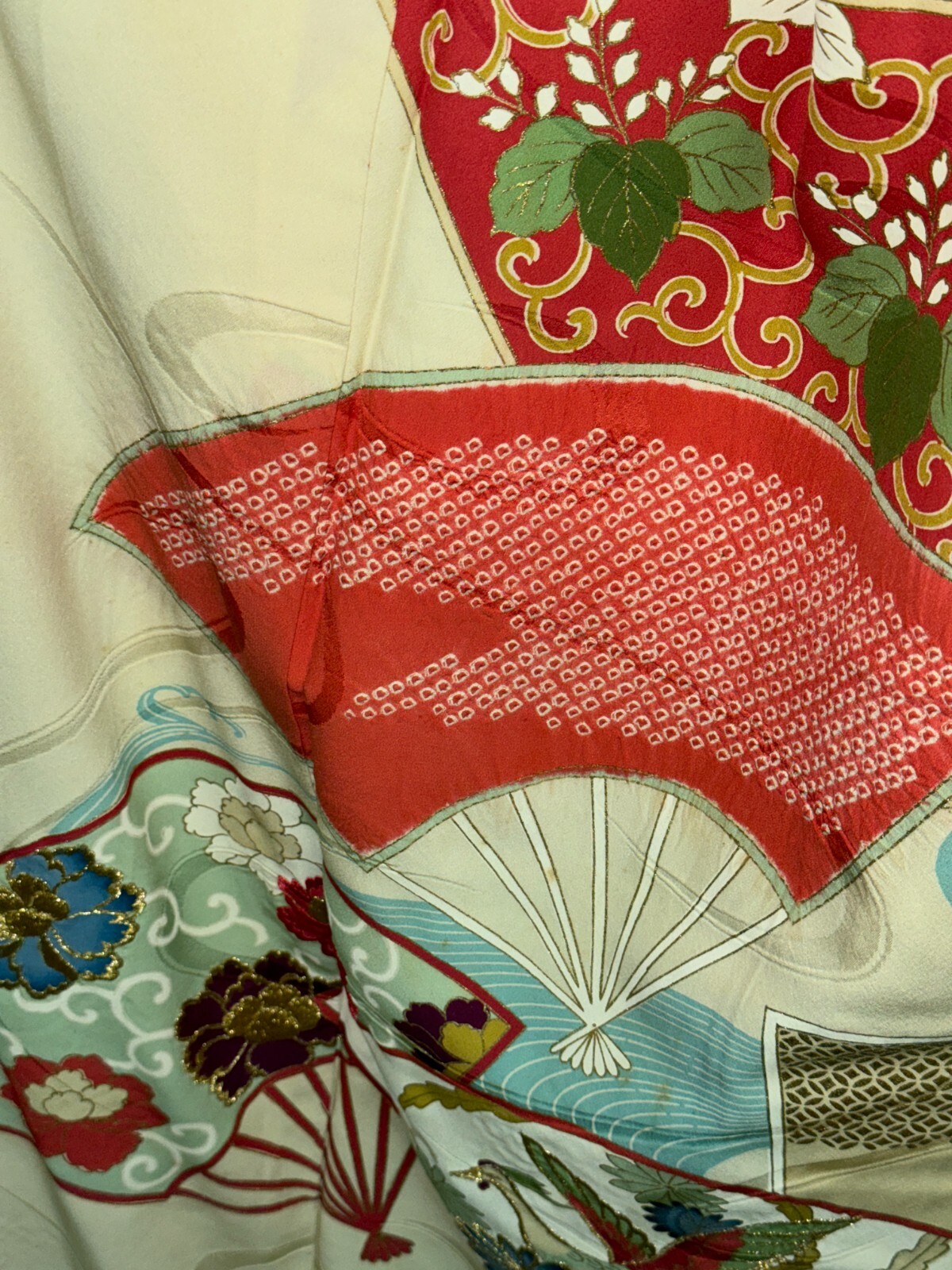 Japanese Vintage Kimono Furisode silk White Flower Fan Expensive Height 61.41in