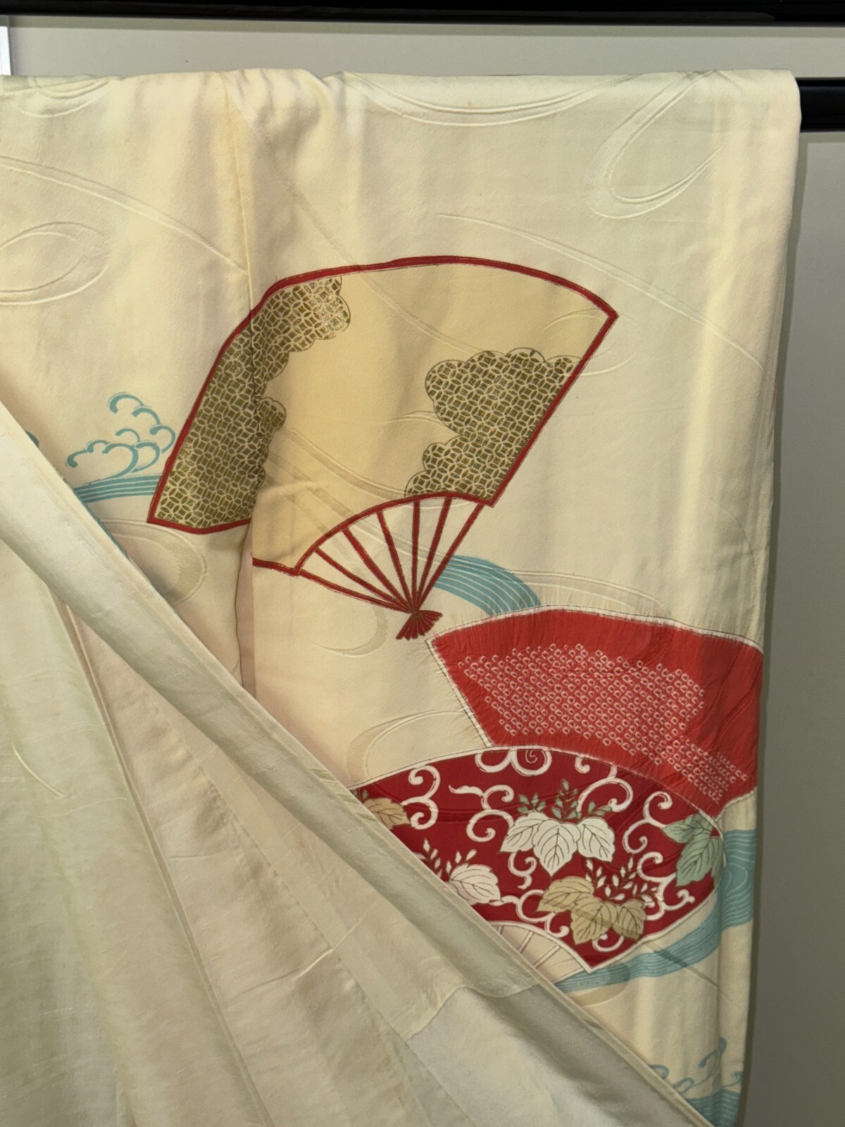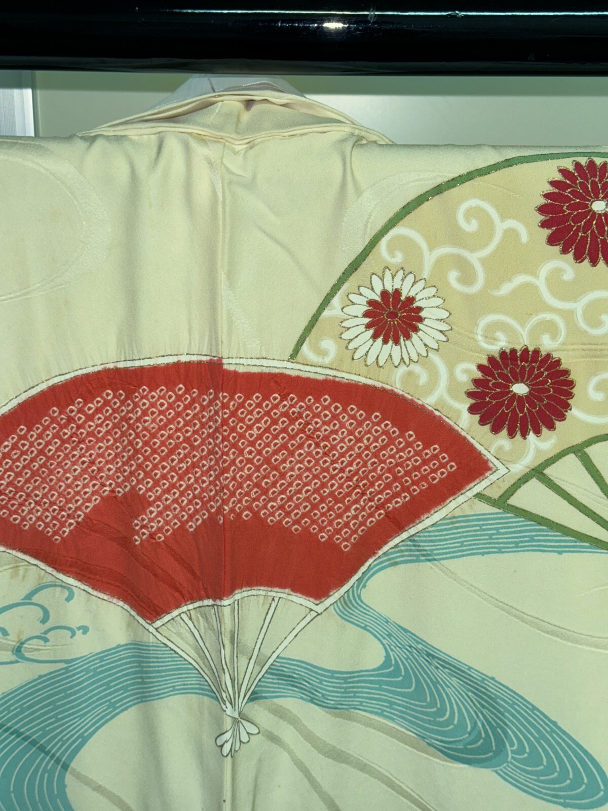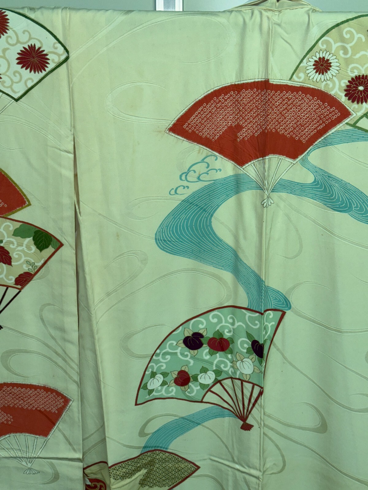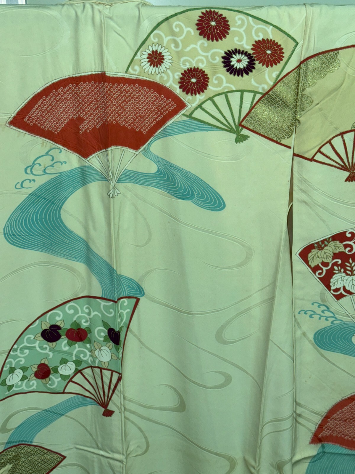 Japanese Vintage Kimono Furisode silk White Flower Fan Expensive Height 61.41in