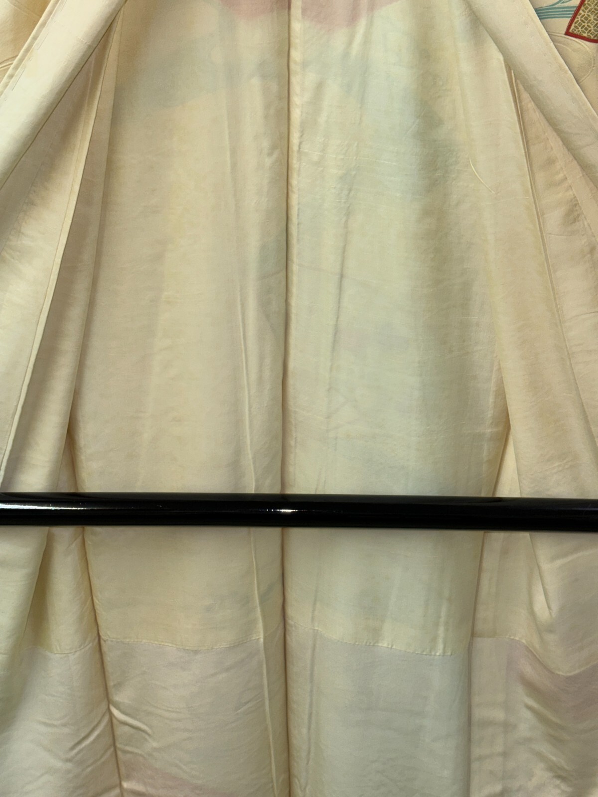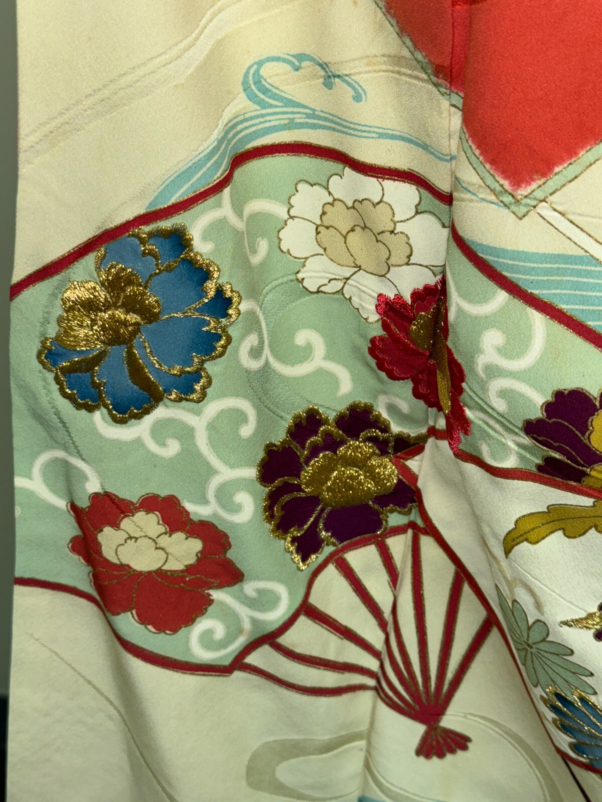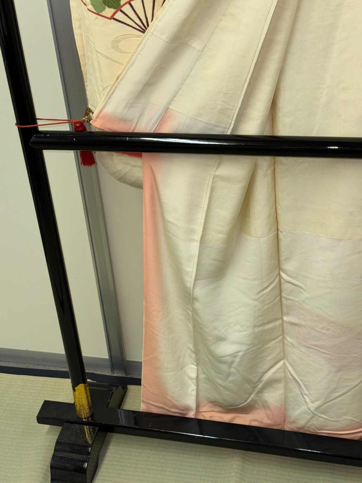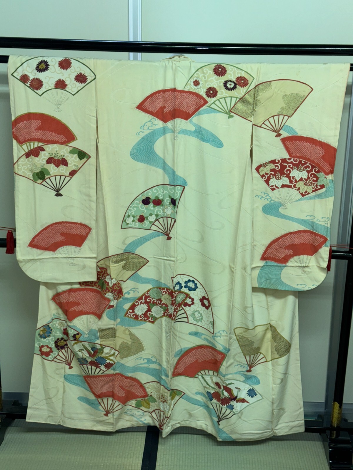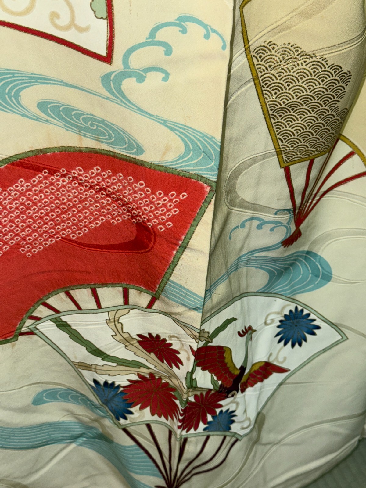 Japanese Vintage Kimono Furisode silk White Flower Fan Expensive Height 61.41in