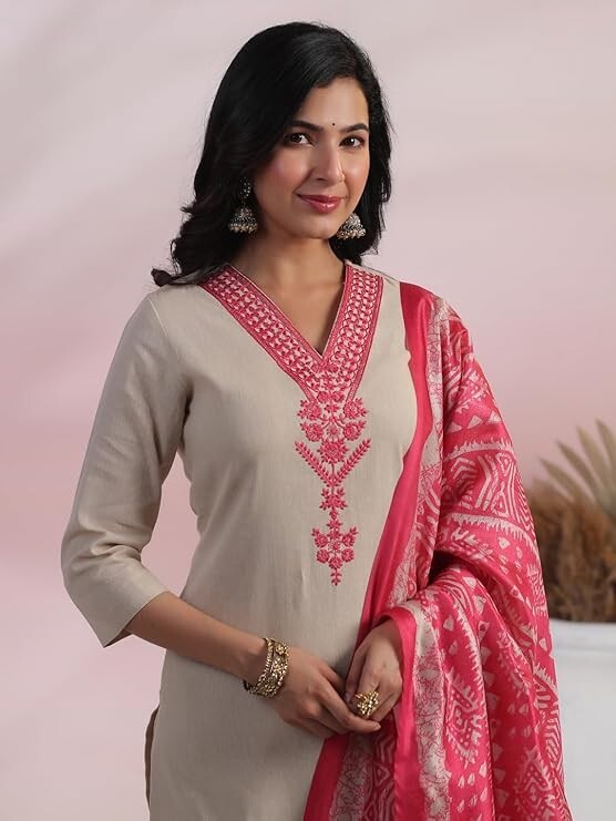 Women Beige Plus Size Embroidered Indian Kurta Top And Trousers With Dupatta