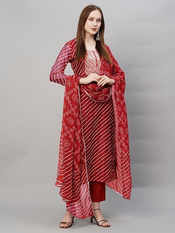 как выглядит Women Red Plus Size Embroidered Work Indian Kurta Top And Trousers With Dupatta фото